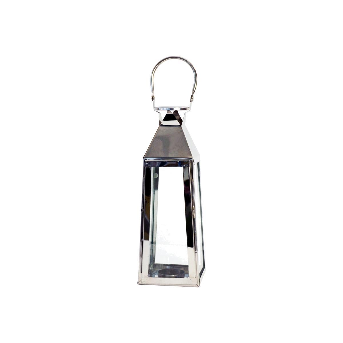 * Unique, Modern Design* Recommended Candle: Tealights Fashioned in a slim pyramid shape, this silver glass lantern is crafted from metal. Complete with a handle, it can hold one tea light holder.