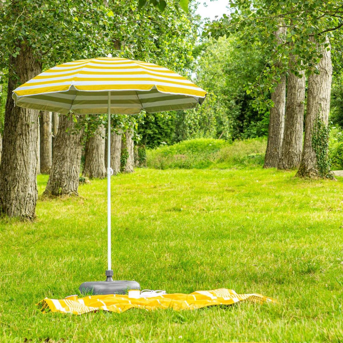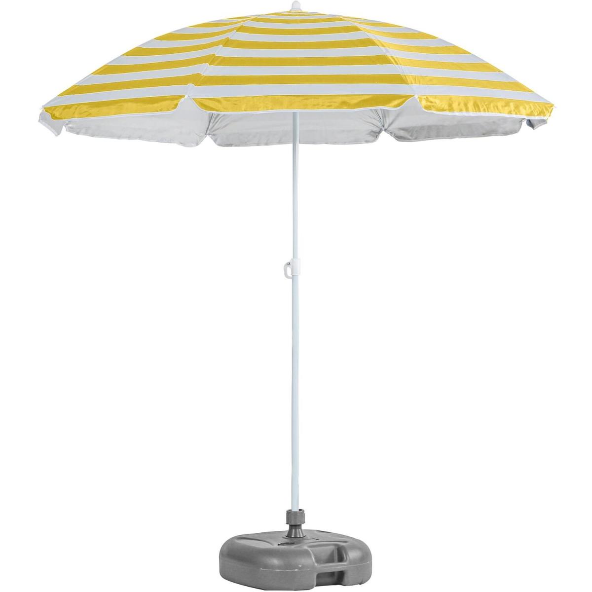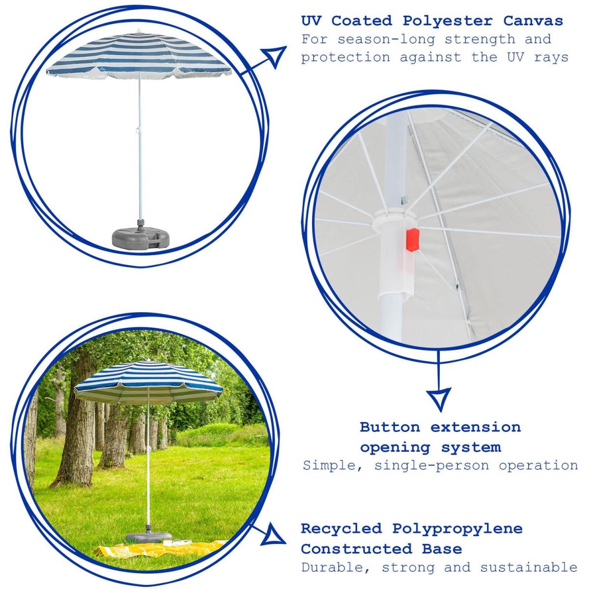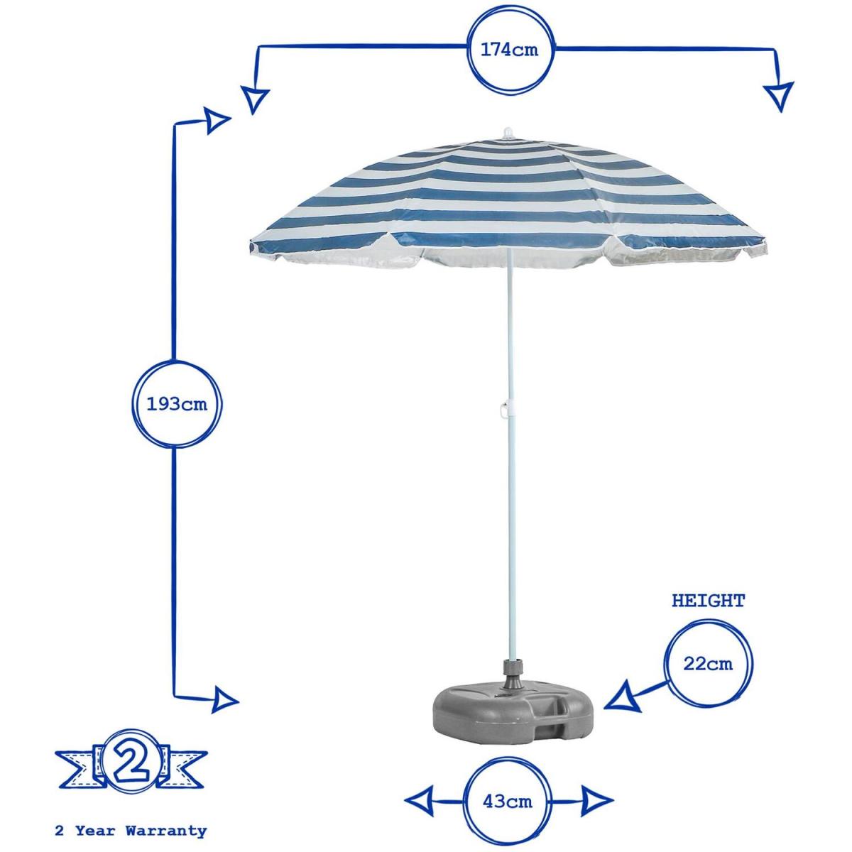 Make the most of your outdoor area by ensuring you can safely sit out for longer with our Harbour Housewares Beach Parasol, pretty and practical!This lightweight Parasol consists of a polyester canvas, with a UV coating and a steel powder-coated frame and pole, producing an incredibly robust and durable product which was made to protect against the harmful rays of the sun and contend with the rigours of the outdoor elements. The easy operation means no getting hot and bothered in the height of summer - simply push the red button, extend the pole, then click into place and you have a parasol ready to keep you cool, calm and collected!Great for your garden or take it to the beach - this two-piece set also includes a refillable Parasol Base for the complete al fresco summer setup.