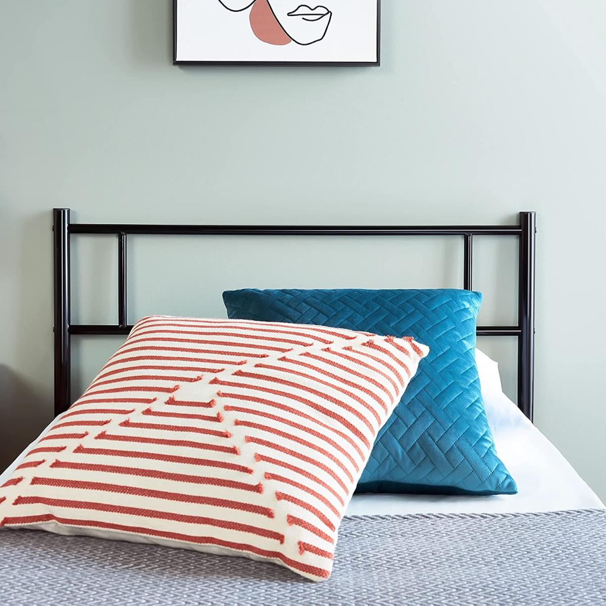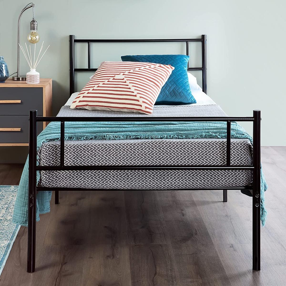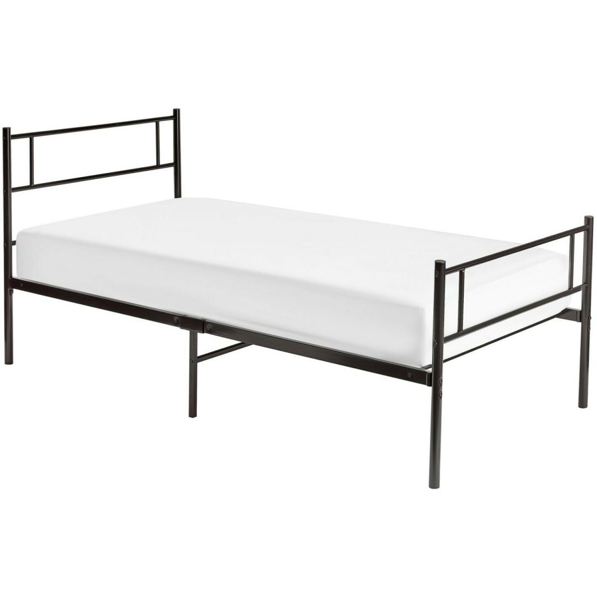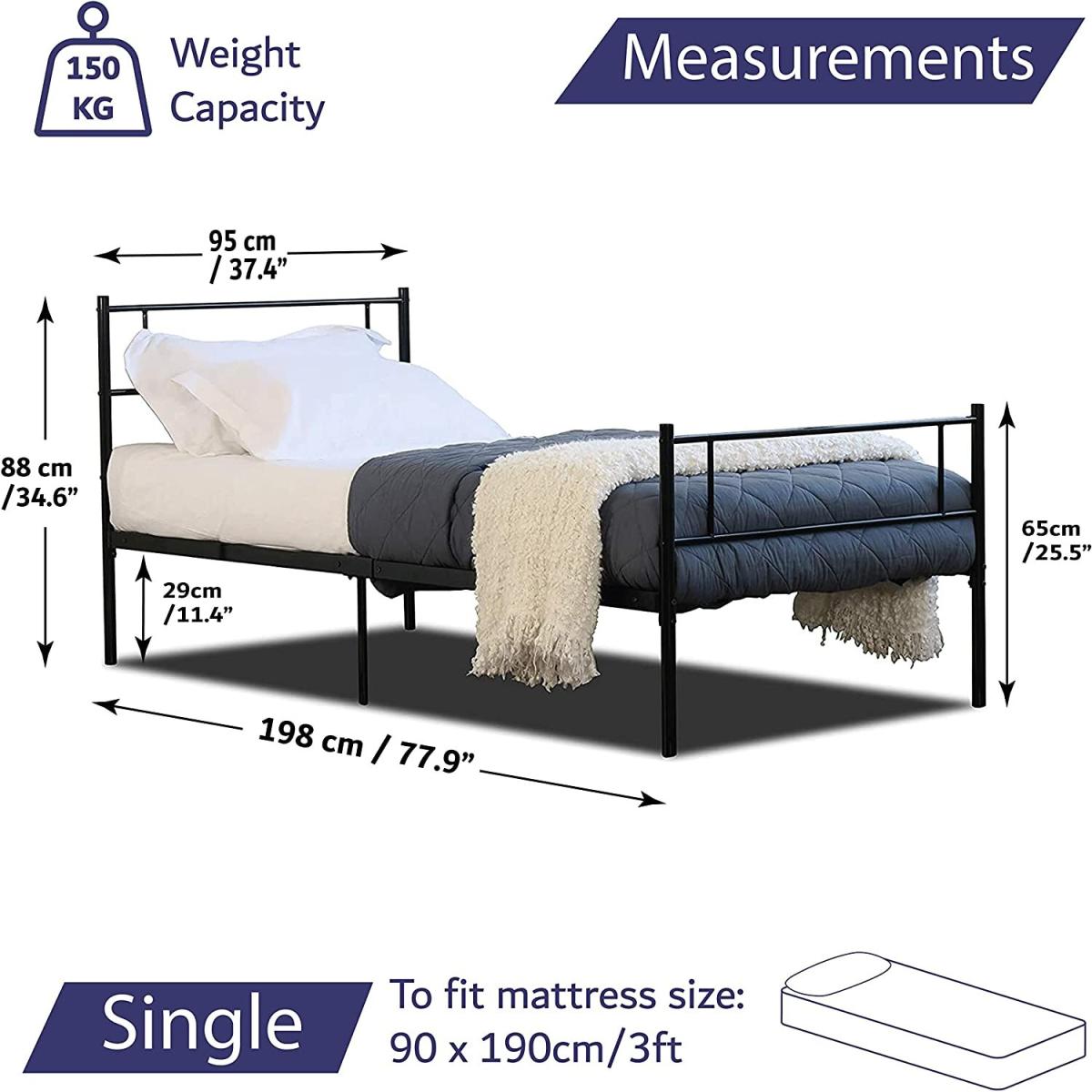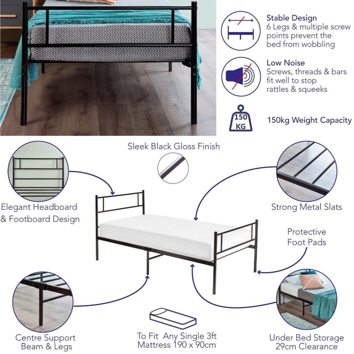 Single metal bed frame with high gloss shine finish. This sleek black bed frame is sure to effortlessly compliment your bedroom interiors. Crafted from high quality, sturdy metal with 4 strong legs and 2 extra central legs for extra support. The robust metal slats support mattress weight and ensure you sleep in peace and comfort. This bed takes any standard single mattress. Fits single mattress 190 x 90cm 3F T. Perfect for adults and children alike, a great addition to your guest room. The 26cm floor clearance on the sides and higher at footboard easily let you slide and store objects underneath.