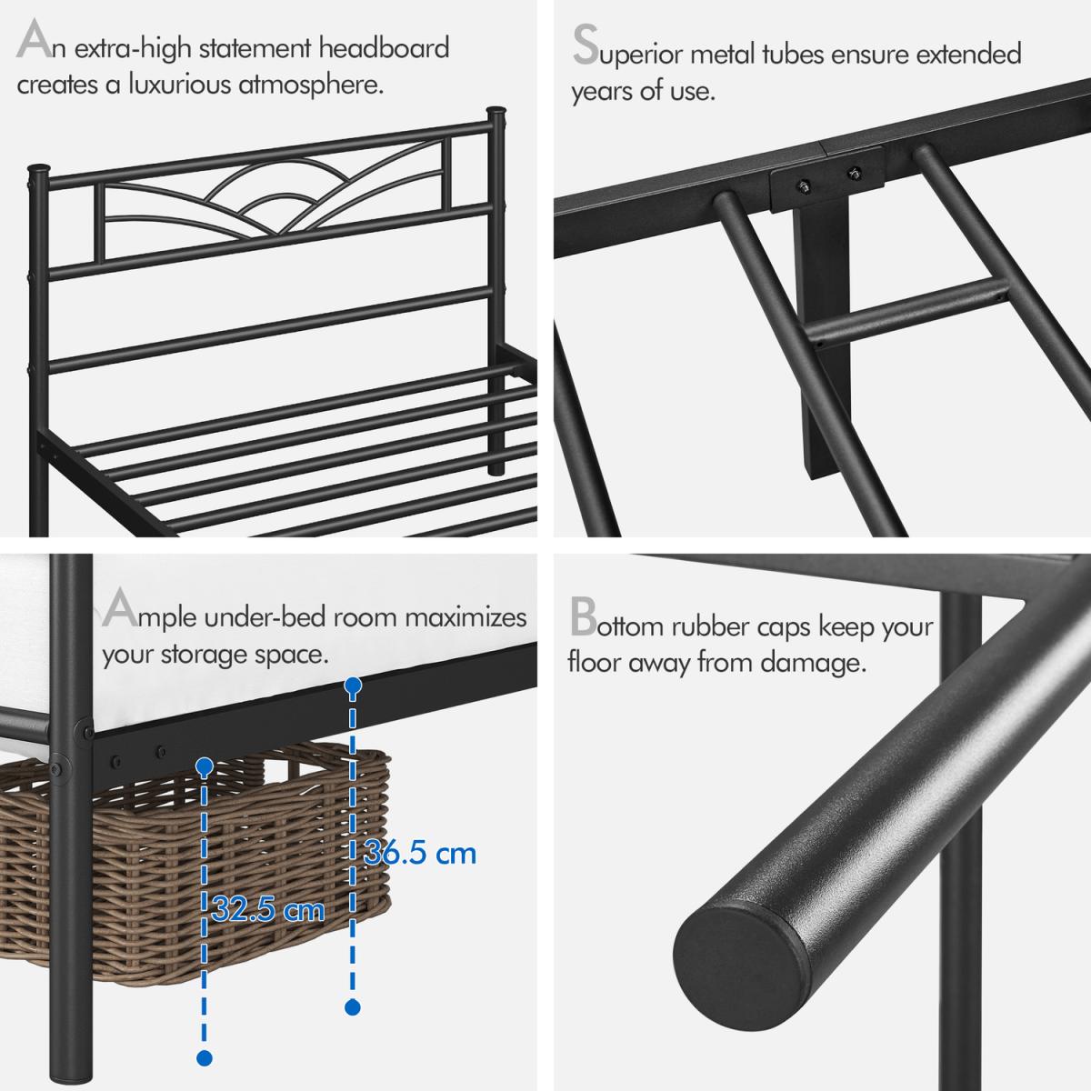 Refresh your bedroom or spare room with this elegant metal platform bed with a headboard and footboard. Minimalist but graceful, this metal bed is defined by its clean-lined silhouette and cloud-inspired headboard, adding a touch of elegance and freshness to your home. Constructed of a solid and durable metal framework, this bed frame features multiple strong support legs that provide optimal stability for any type of latex, memory foam or spring mattress without a clumpy box spring. Thoughtful details like additional corner braces and non-slip foot caps all work together to provide you with a noise-free night's sleep. Additionally, the platform bed frame creates valuable under-the-bed space for storing your luggage, shoes, bags, and other odds ends, keeping your bedroom organized and clutter-free.