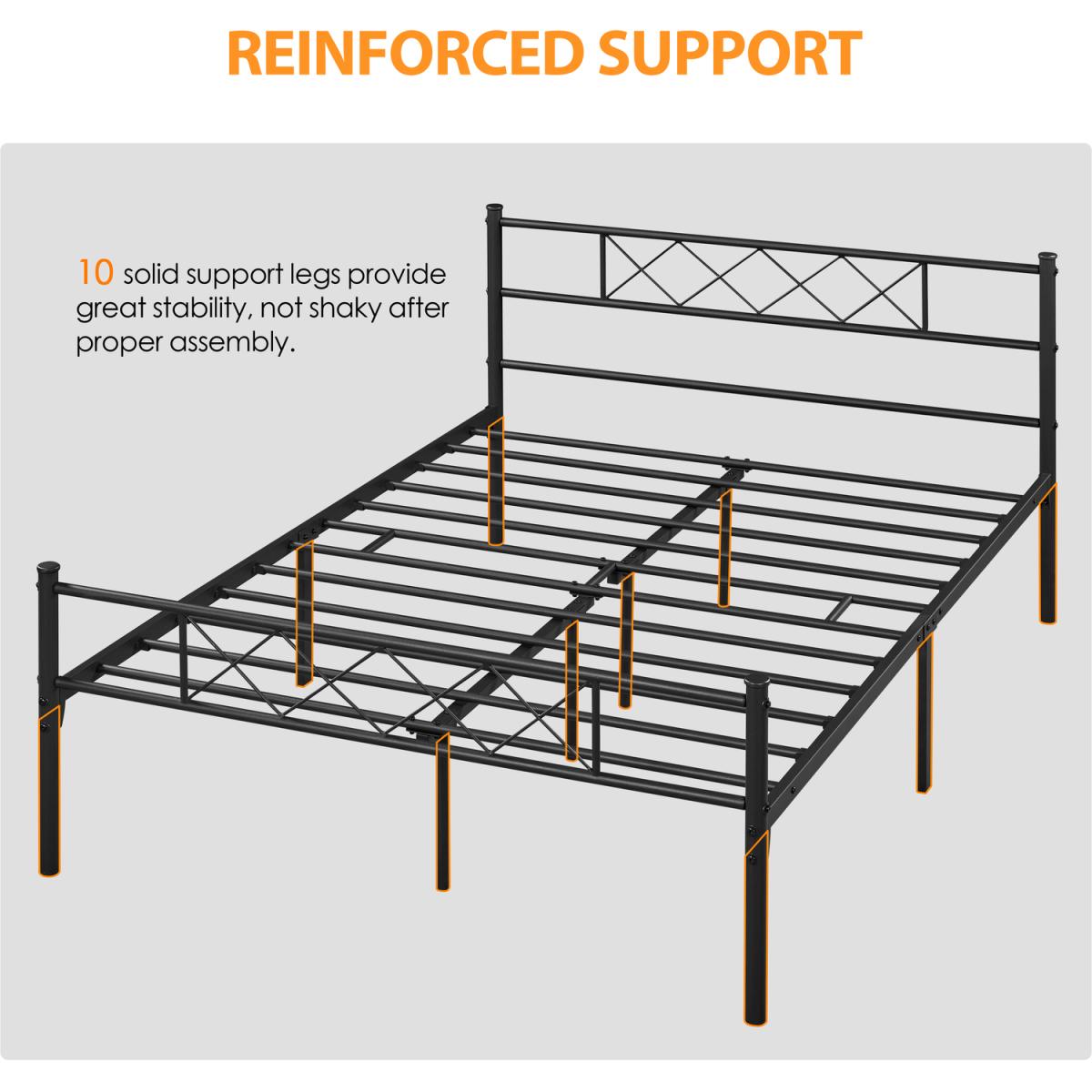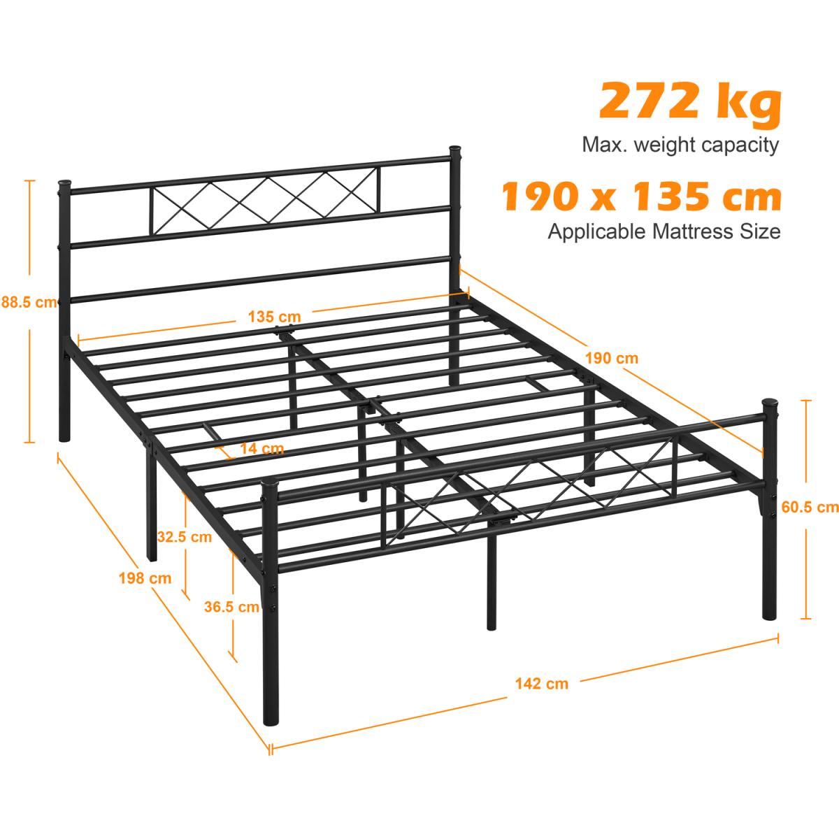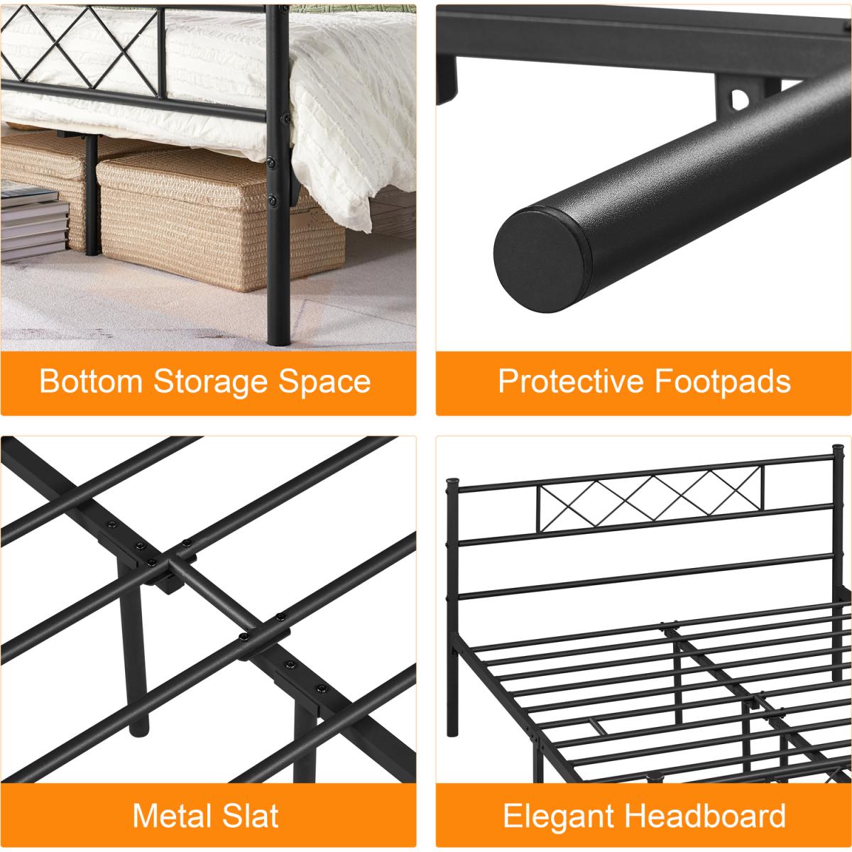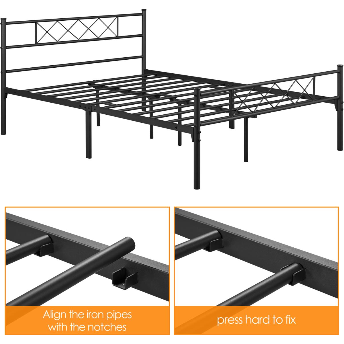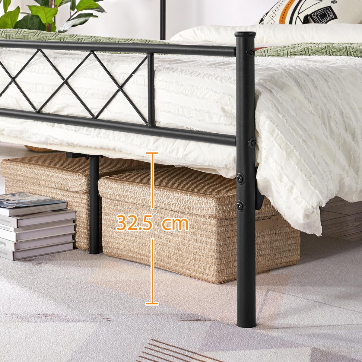 Update your bedroom with a cross-design metal bed frame for an industrial look. The head and foot end respectively showcases a row of x-shaped iron bars, which defines the aesthetic taste of the bed frame. Crafted of metal slats, side rails center rails, and support legs, our metal bed frame is sturdy enough for a good night's sleep without the need for a bulky box spring. A well-painted surface resists scratch and oxidation and is easy to maintain. With 32.5cm of clearance under the bed, there is plenty of space for storage boxes and baskets. Plus, the headboard offers a perfect place for you to lean back and relax by plumping up your pillows. Ideal for bedrooms, guest rooms, dormitories, apartments, and more.