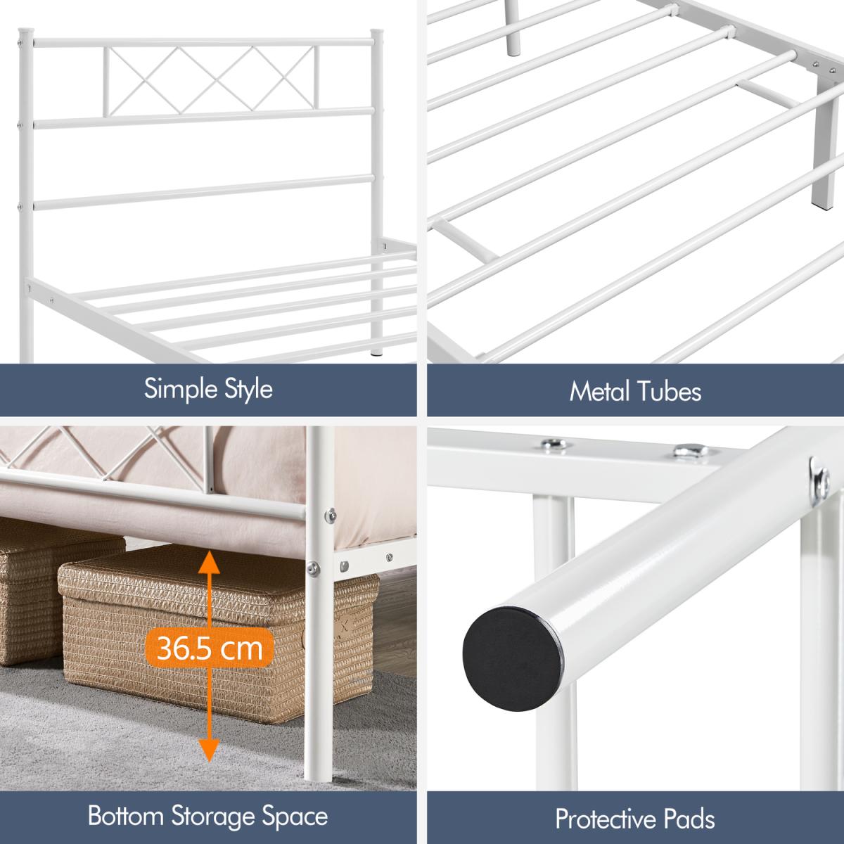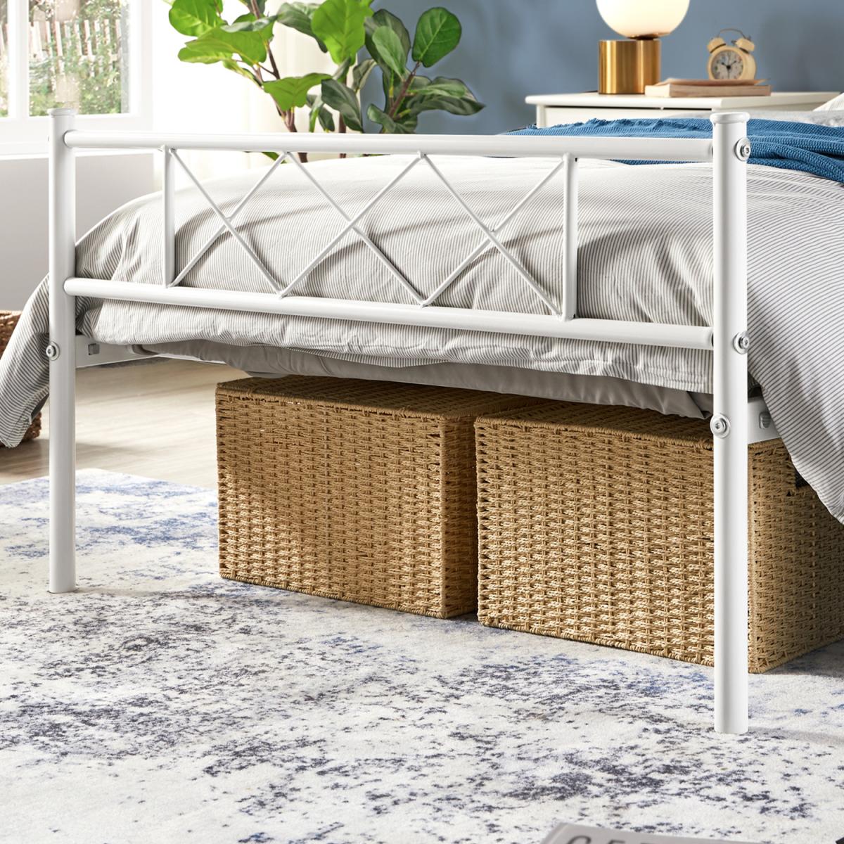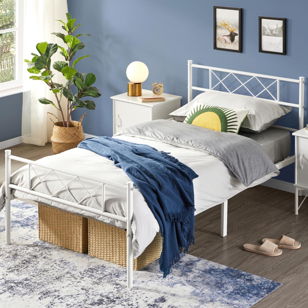 Update your bedroom with a cross-design metal bed frame for an industrial look. The head and foot end respectively showcases a row of x-shaped iron bars, which defines the aesthetic taste of the bed frame. Crafted of metal slats, side rails center rails, and support legs, our metal bed frame is sturdy enough for a good night's sleep without the need for a bulky box spring. A well-painted surface resists scratch and oxidation and is easy to maintain. With 32.5cm of clearance under the bed, there is plenty of space for storage boxes and baskets. Plus, the headboard offers a perfect place for you to lean back and relax by plumping up your pillows. Ideal for bedrooms, guest rooms, dormitories, apartments, and more.