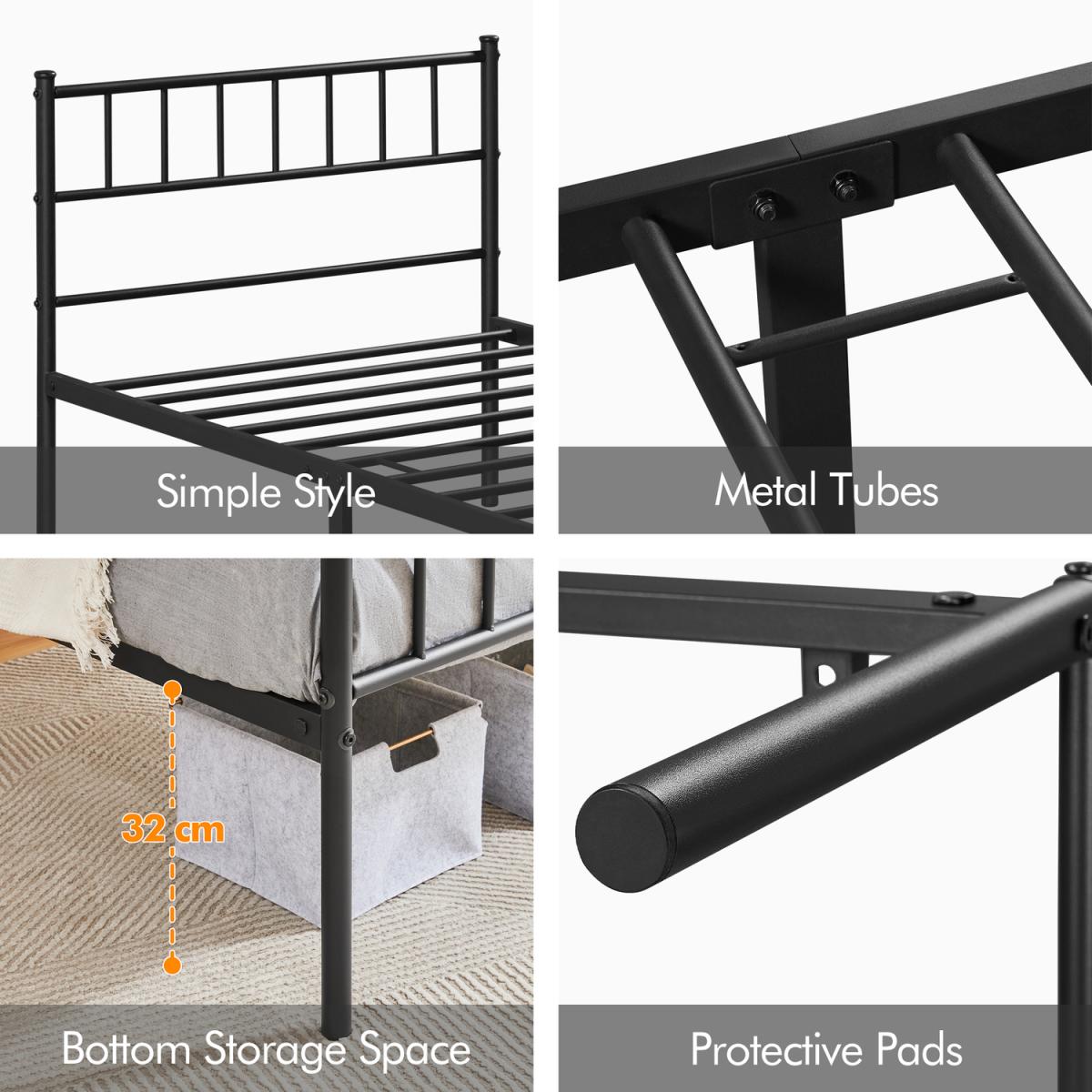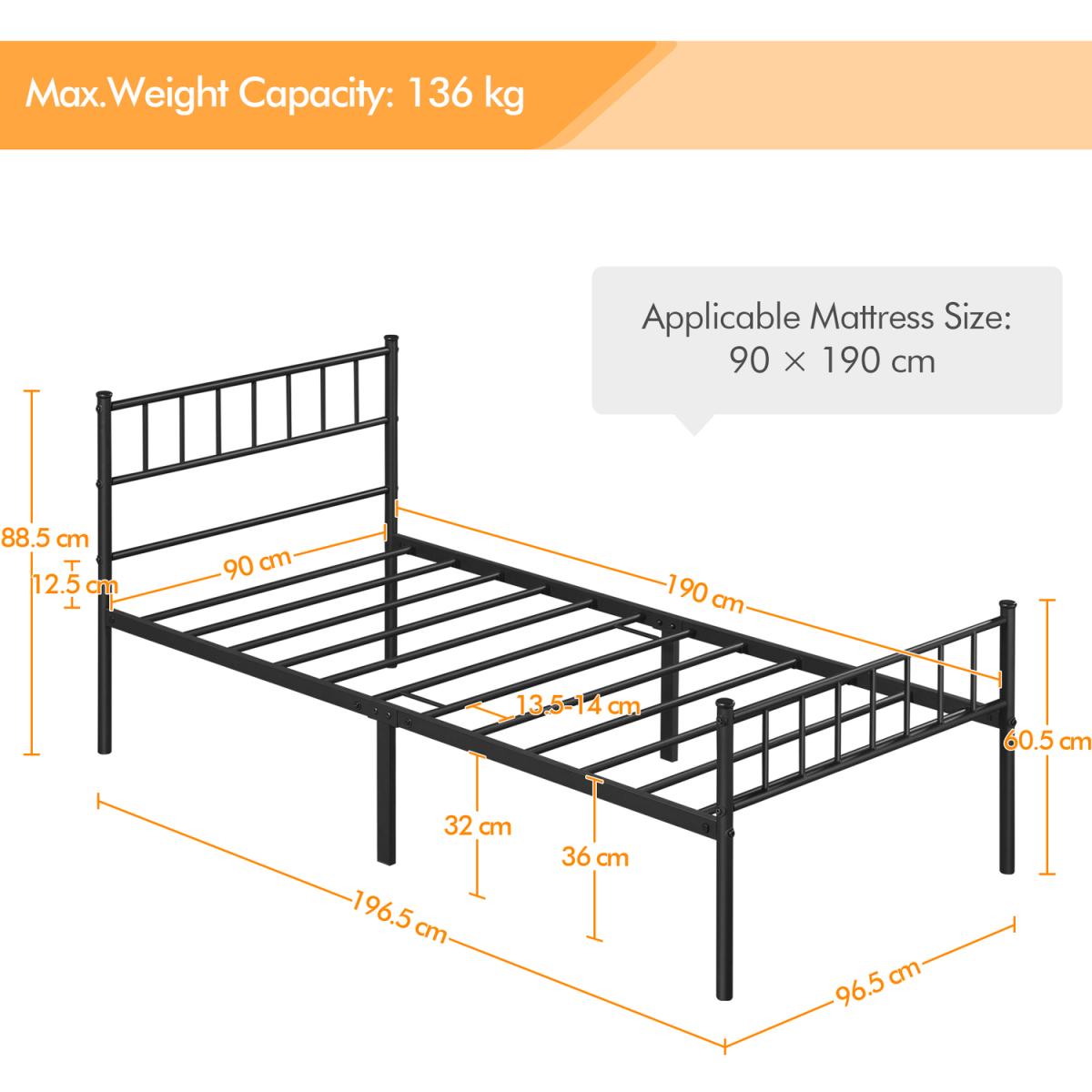 With simple lines and an open design, this 3ft single bed frame with a slatted headboard will be a good addition to your home. The metal tube base combined with a matte black finish creates a strong industrial vibe that is suitable for all traditional and contemporary decor homes. Crafted of metal slats, side rails and 6 solid legs, our single bed base is capable of holding up to 136 kg. The premium iron frame is powder coated for scratch and rust resistance. Cleaning will be a breeze, wipe clean with a soft, dry cloth. The 32cm of clearance under the bed well enlarges your bedroom storage space. It will be a good addition to bedrooms, guest rooms, spare rooms, dormitories, flats and more.