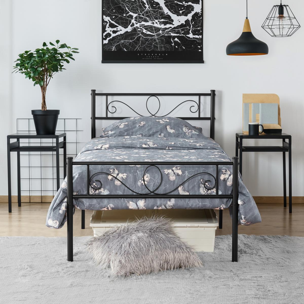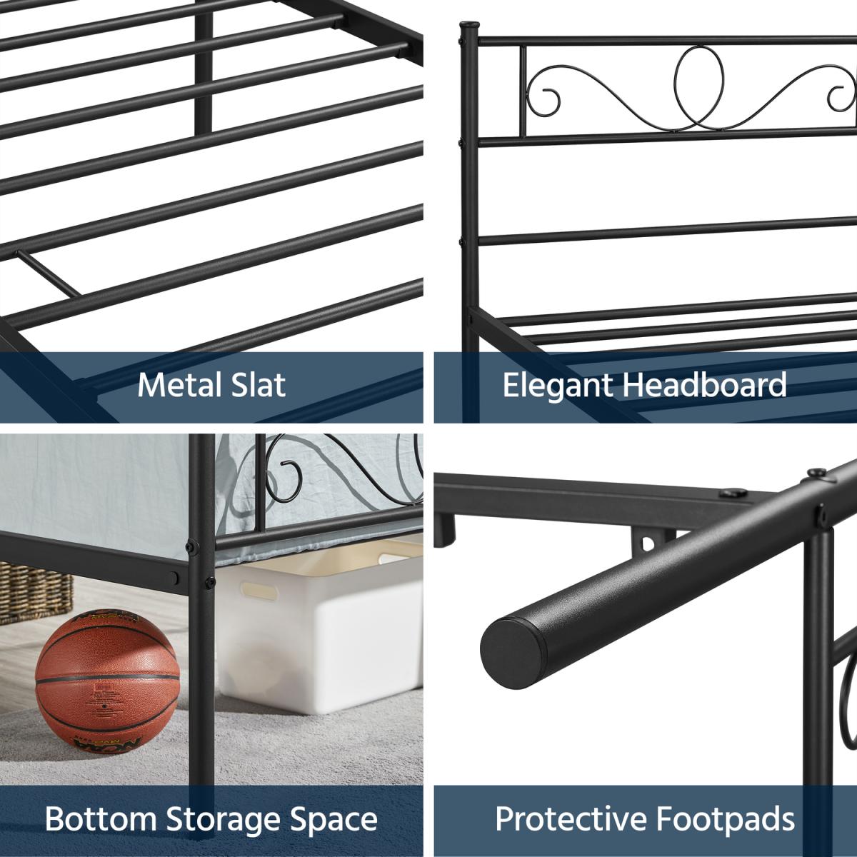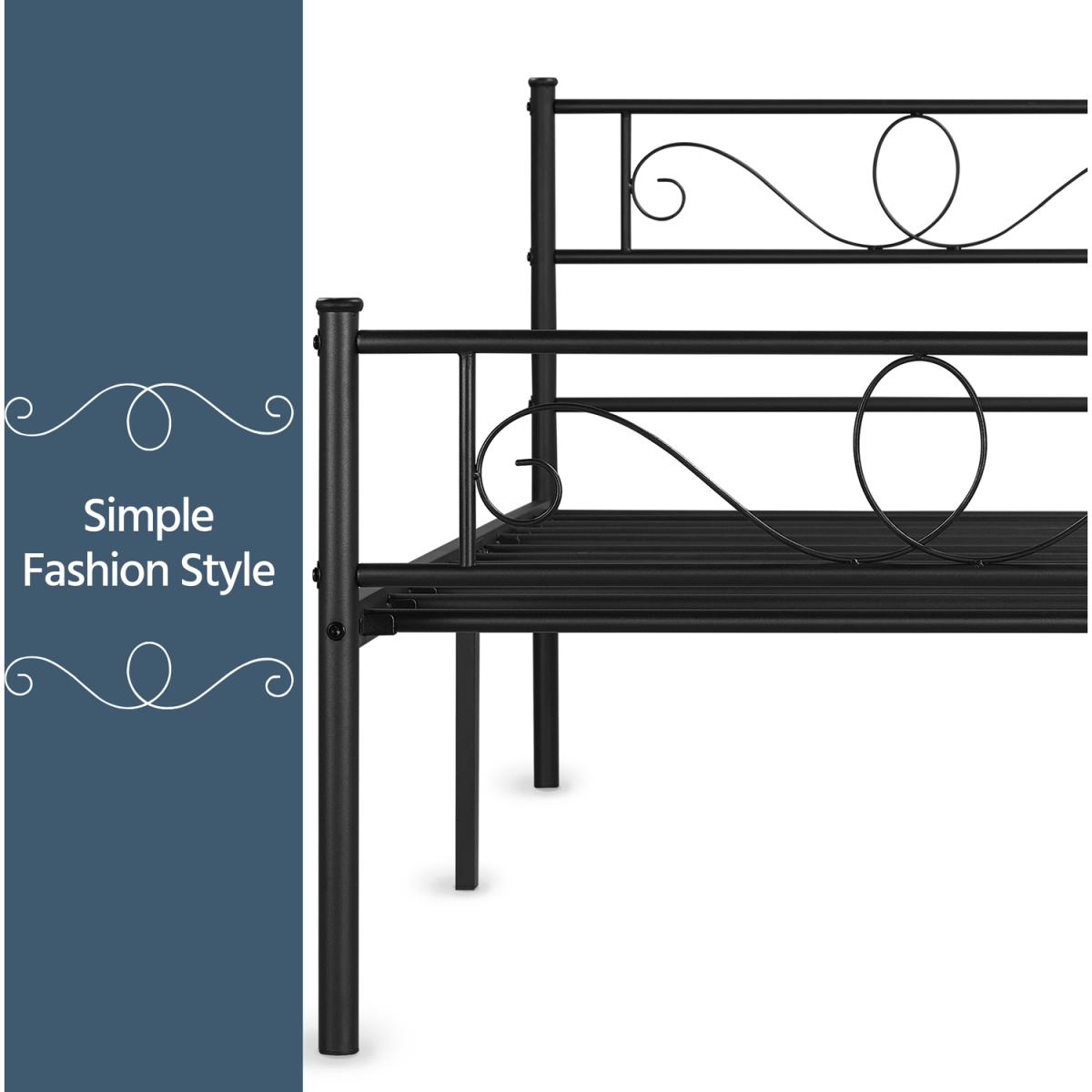 Update the look of your space with this graceful metal platform bed. This bed base features a metal slat frame in a matte finish that's both striking and elegant with an industrial vibe. The headboard and footboard feature a metal scroll design, adding beautiful decorative detail to the bed. The powder-coated iron frame is scratch and rust-resistant, ensuring a durable bed frame suitable for long-term use. The spacious room available beneath the bed provides additional storage space for boxes and cases, the perfect addition to any small bedroom in need of more storage. A good addition to the bedroom, guest room, dormitory, apartment and other small spaces.