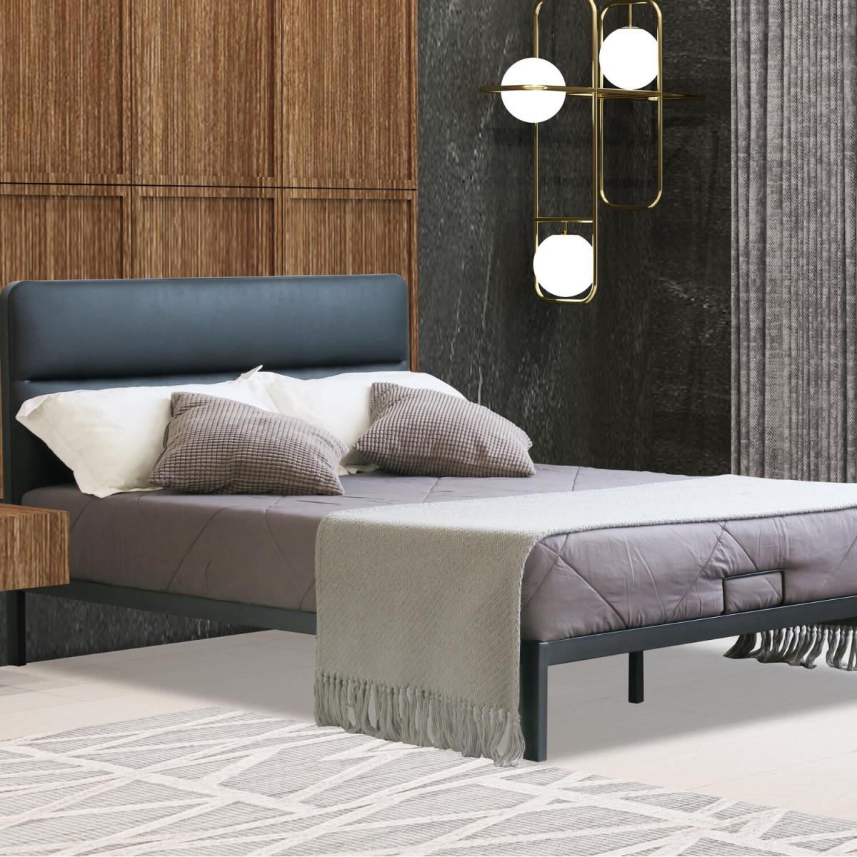 Metal Bedframe with Faux Leather Headboard - Black / Double