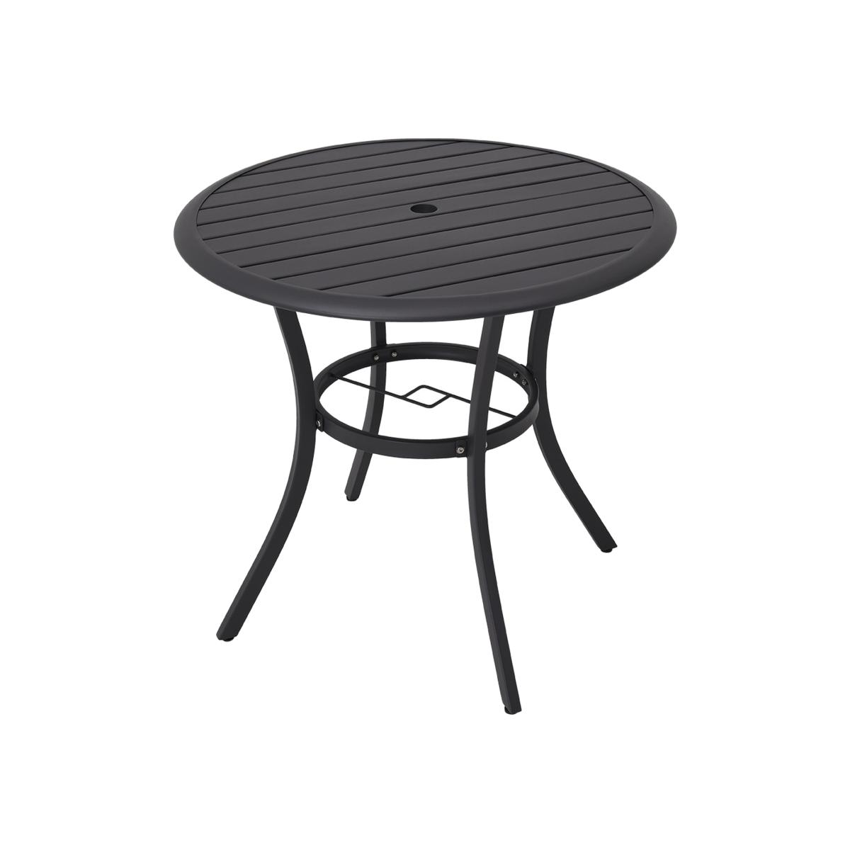 Enjoy a cozy outdoor chat around our Table and Rattan Chair Set. Crafted from durable metal with an anti-corrosion coating, the table offers a sleek look and enduring quality. Its built-in parasol hole makes adding shade simple. The set includes two PE rattan chairs supported by a rustproof metal frame, ensuring they stay strong and stylish even in tough weather. Metal Bistro Set Garden Slatted Table with Two Rattan Chairs - Dark Grey / 1 Round Table and 2 Rattan Chairs