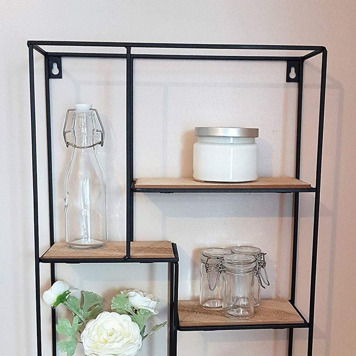 This metal black wall shelf is a versatile piece that adds an industrial edge to any space. I love how it combines sleek metal framing with warm wooden shelves, making it adaptable for both modern and rustic interiors. It works particularly well in living rooms, kitchens, or offices where you want to display books, plants, or decorative accessories without visual clutter. Practical styling tips include pairing it with monochrome or neutral tones to let the materials stand out, and grouping smaller items to keep the shelf looking organised. Using the different shelf heights creatively, such as placing taller vases or framed photos on higher levels, can add visual interest while maintaining an organised feel.