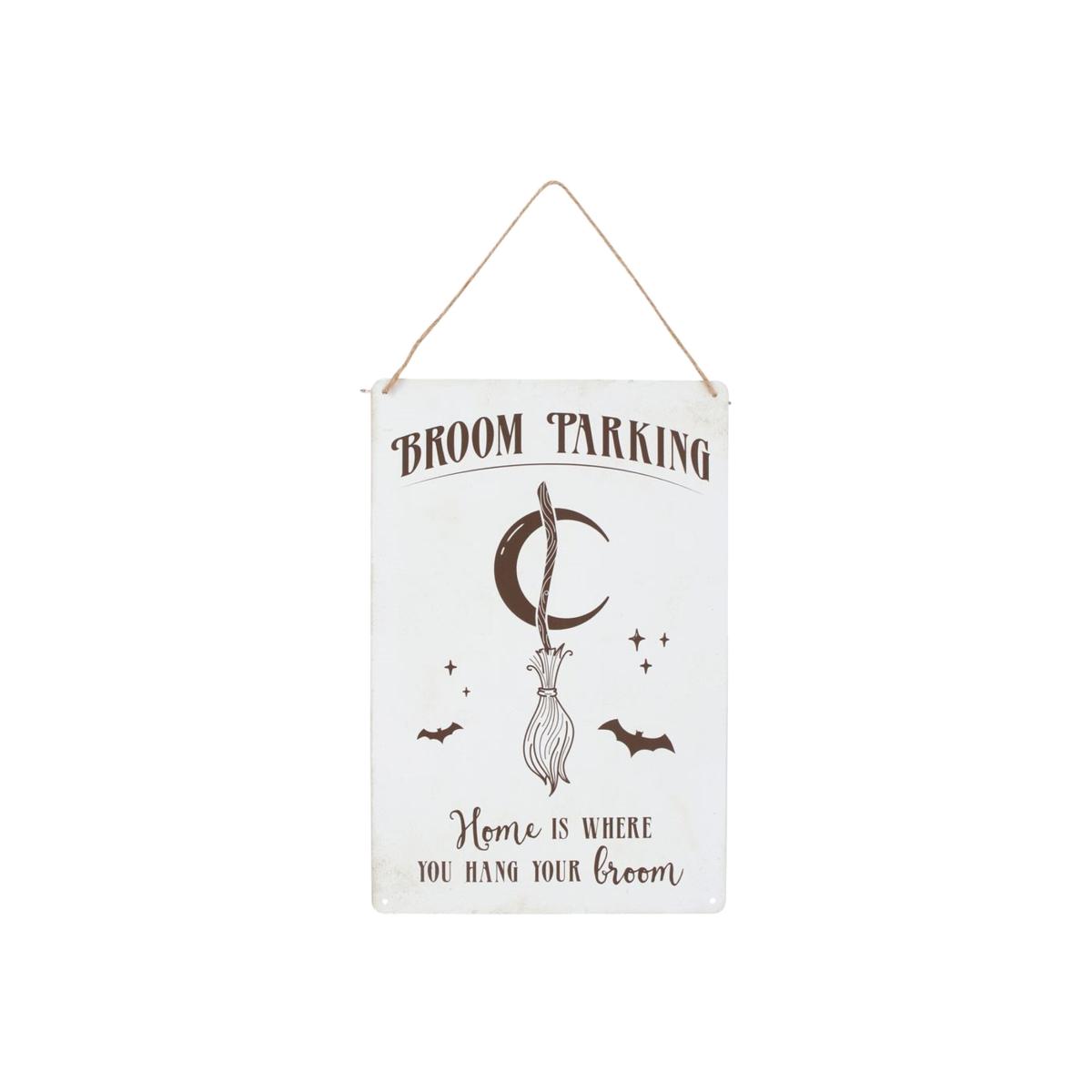 Show your witchy side with this metal Broom Parking sign, Features a broomstick, bat and crescent moon illustration with the text:Home is Where You Hang Your Broom. This sign has a rustic aged look.