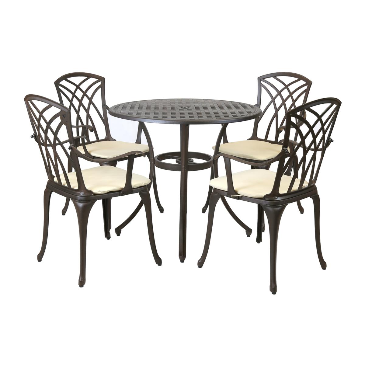 Ideal for dining and entertaining outdoors, this garden furniture set is made from high quality cast aluminium with a rustic bronze finish. The set has an elegant design that is unique and attractive. It includes a round table, four arm chairs and four cream cushions and would be ideal placed on a patio or decking. Features Central hole for placing an umbrella (2 Inch diameter)Weatherproof Black cast aluminium with a bronze finishIncludes. 4 x arm chairs1 x table4 x cushions (cream)Materials. Cast aluminium. Polyester cushionsDimensions Table - Dia. 85 x H70cm. Arm chair - H89.5 x D48.5 x W47cmWeights. 1 Chair 4.9kg. Table 9.02kg. Additional Info Floor to seat height (excluding cushion) 45cm. Cushion thickness 3cm. Arm to floor height 59.5cm