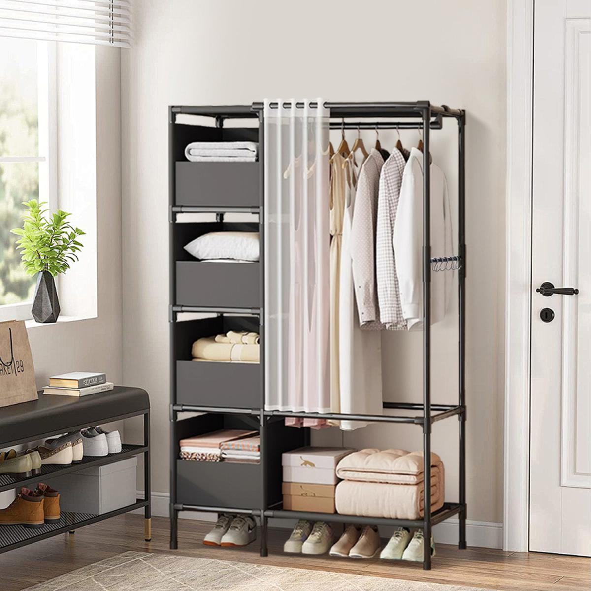 Looking to tidy up a cluttered room? This clothes rack with four baskets is perfect for organizing your clothes. The four baskets let you sort clothes by category, while the main rack holds frequently worn items. Use the side plastic hooks to hang smaller items like hats, and the bottom shelf provides space for additional items such as shoes. For added tidiness, draw the front curtain to maintain a neat appearance. Crafted from thickened steel, this clothes rack is both sturdy and durable. Choose this rack for an efficient storage solution for your clothes.