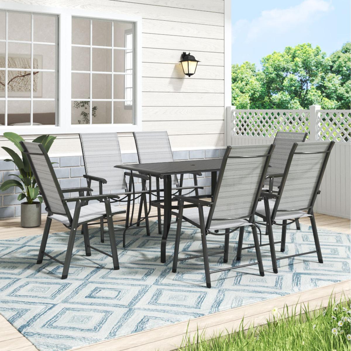 This coffee table and folding chair set is ideal for creating a comfortable and relaxing dining space. The set includes a metal coffee table that requires assembly and six folding chairs. The table features a 4.1 cm diameter hole in the centre, perfect for placing a parasol. Its metal slatted tabletop allows water to drain away easily, making it suitable for outdoor use. The anti-corrosion coating on the metal surface ensures long-lasting durability and makes the table easy to clean and maintain. The six folding chairs have a sturdy metal frame, with breathable fabric for the backrest and seat cushions, providing comfort and support. The chairs are highly breathable and can be folded to save space when not in use. This coffee table and chair set creates a cosy spot for you, your friends, and family to gather, eat, chat, and enjoy leisurely moments together.
