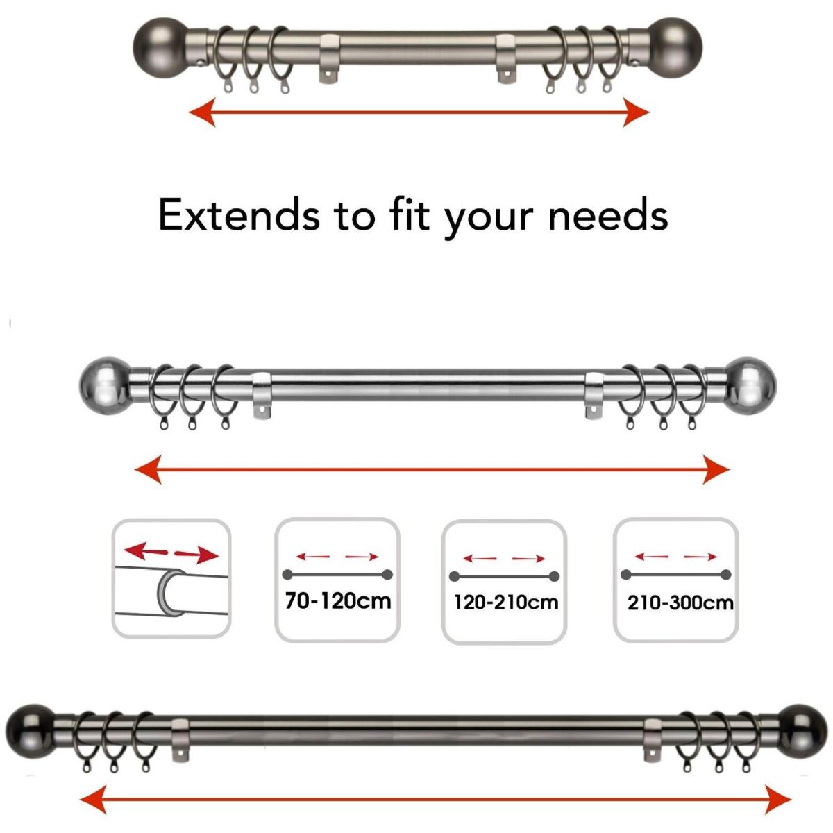 Adjustable Extendable metal curtain pole set 25-28mm. Fully telescopic pole slides to suit your window perfectly with aesthetic large ball finals for a stylish elegant finish to any room. Durable full metal curtain pole with high shine superior plated finish, rust and corrosion proof. Strong thick metal pole suitable for heavy fabrics, curtains & voiles perfect for full-length curtains of all thicknesses. Easy to fit with all hardware, rings, bracket, fittings, finials included.