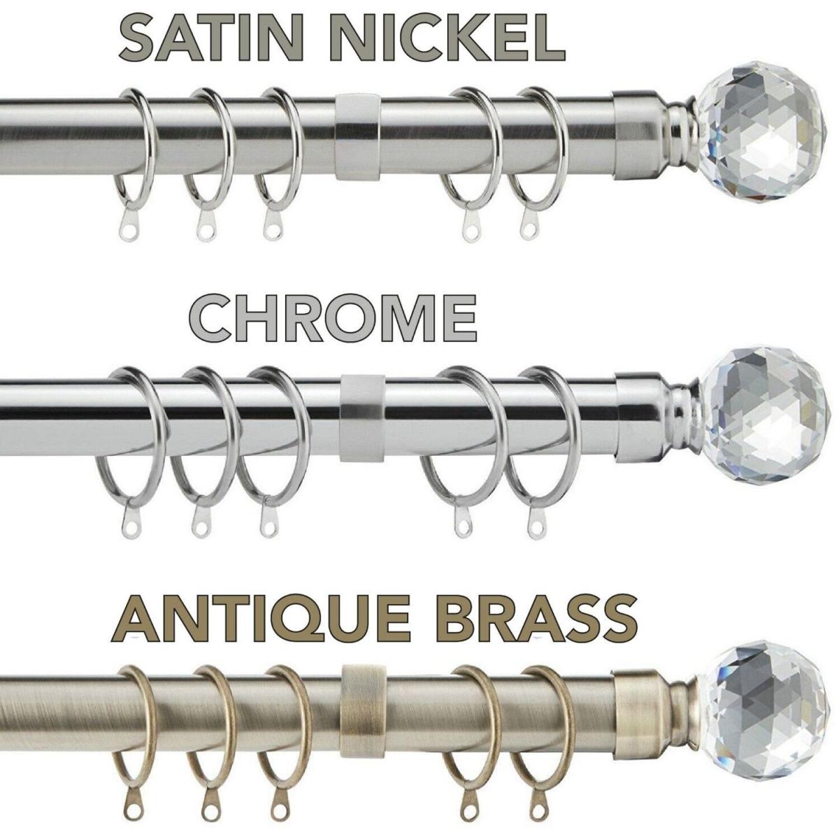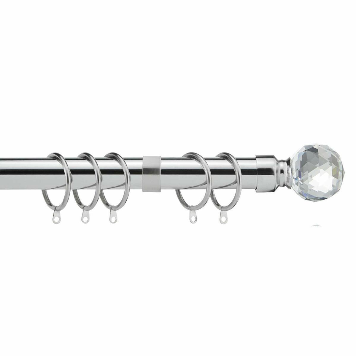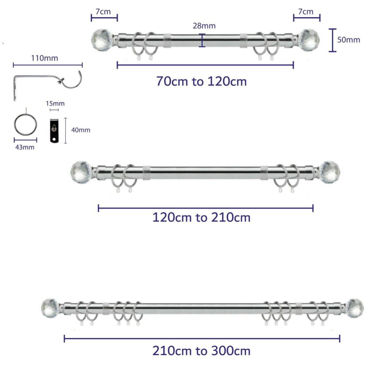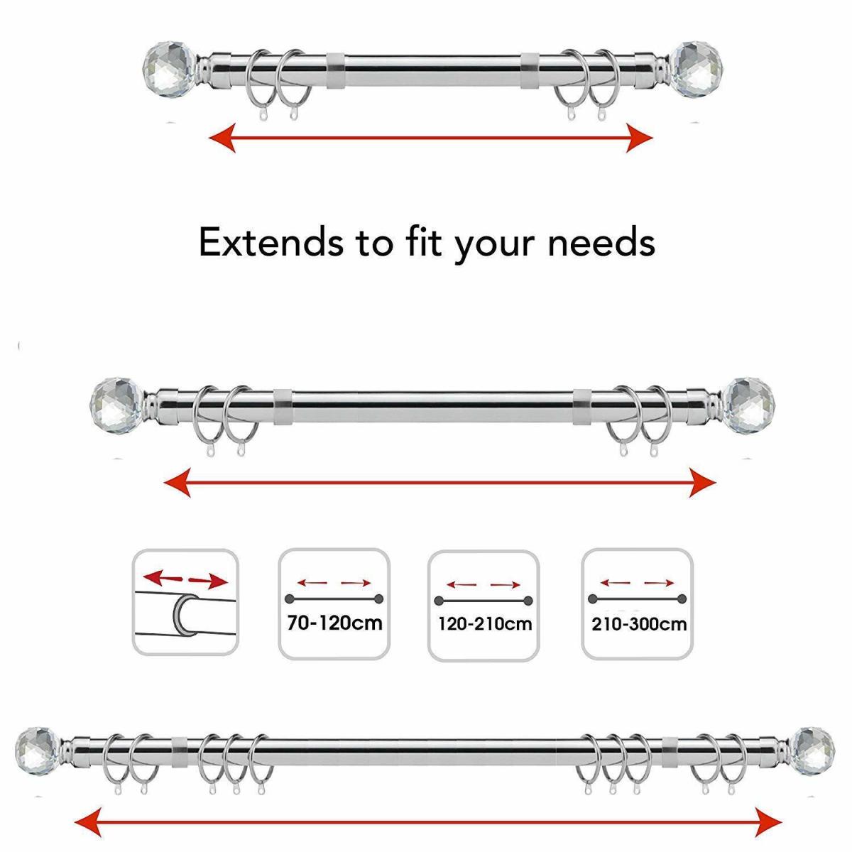 Adjustable Extendable metal curtain pole set 25-28mm. Fully telescopic pole slides to suit your window perfectly. Aesthetic stunning crystal finals for a stylish elegant finish to any room. Durable full metal curtain pole high shine superior plated finish, rust and corrosion proof. Strong thick metal pole suitable for heavy fabrics, curtains & voiles perfect for full length curtains of all thicknesses. Easy to fit with all hardware, rings, bracket, fittings, finials included