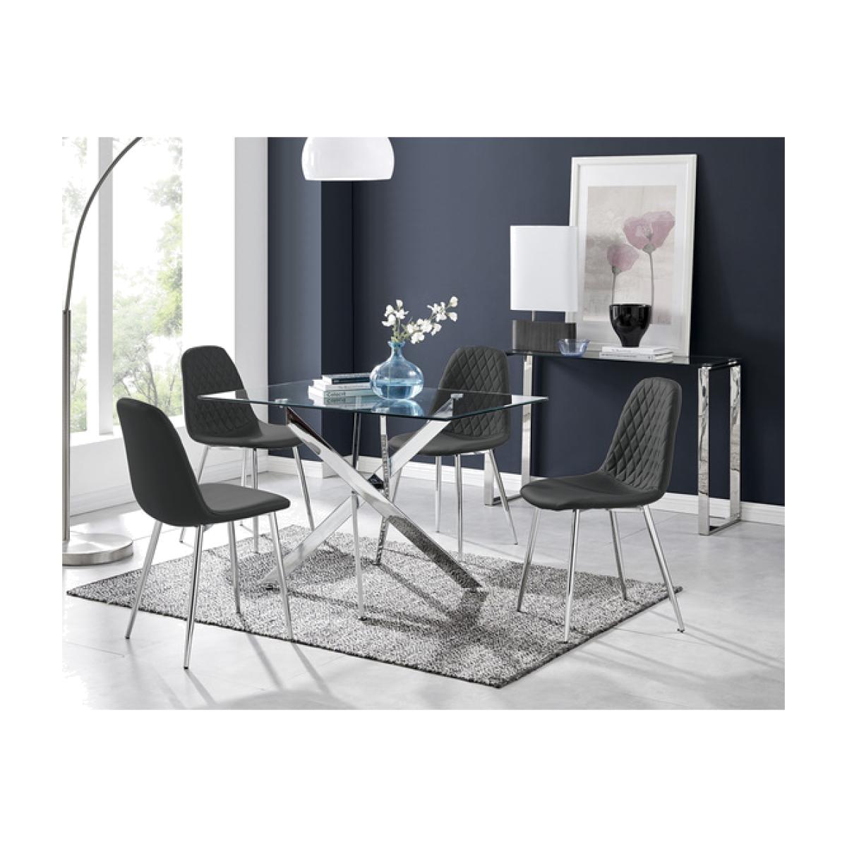 Combining modern design and simplicity with an edge, our Leonardo dining table gives a minimal visual footprint with sheer transparency. The table features a 120x70cm tempered glass top that will easily stand up to the demands of a busy household and with architecturally styled intertwined legs for a beautiful finish, It's as practical as it is good-looking. Paired alongside our beautiful faux leather diamond Coronachairs, you can't go wrong with this set. With a perfect balance of pattern and texture, the new Corona Chair is a statement piece ready for the modern dining space. The trendy gold or silver chrome legs are all the rage and offer a perfect way to add an accent of lustre to your home. The Scandi-style faux leather seat with diamond pattern stitching is a unique take on a classic design offering comfort and durability for everyday use.