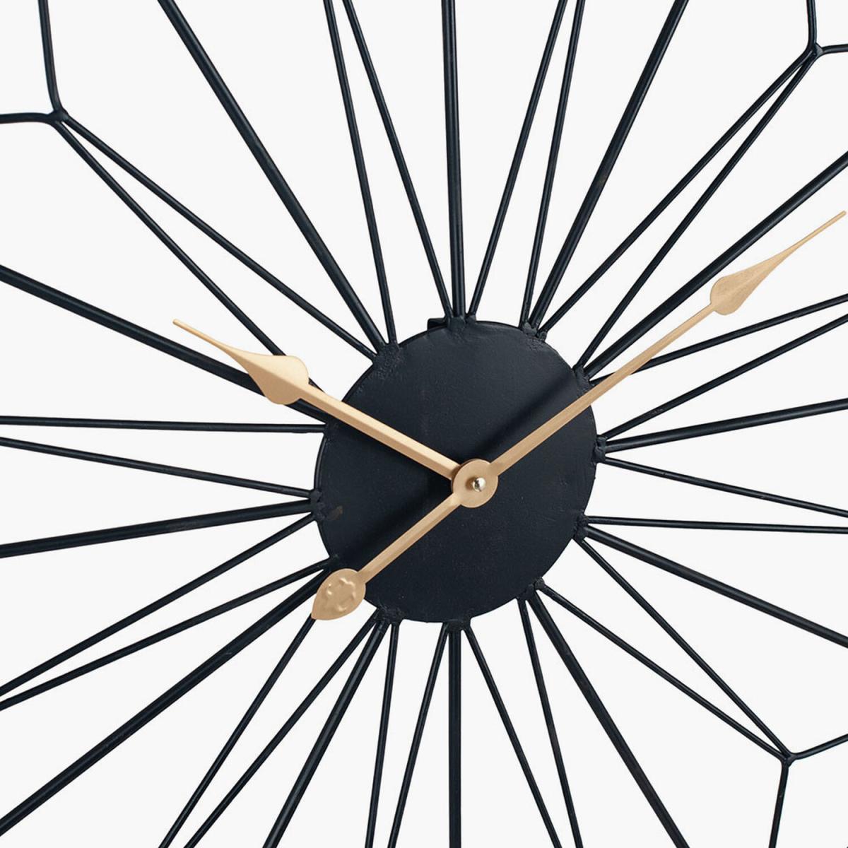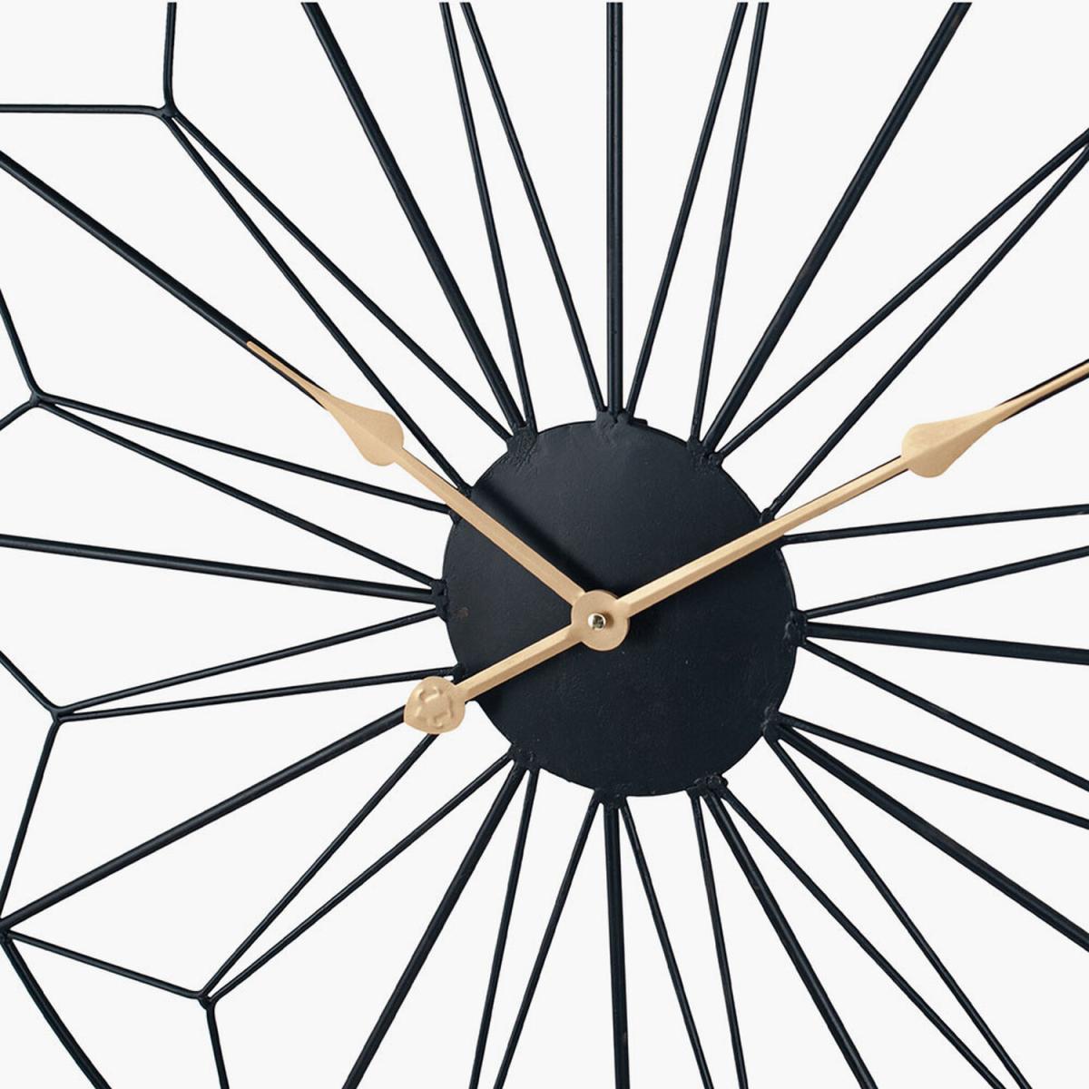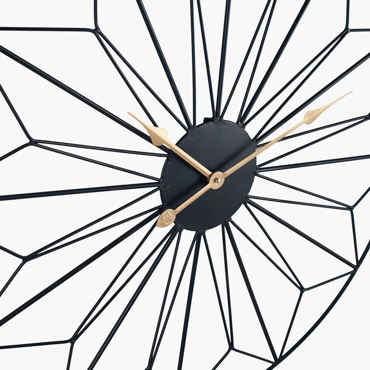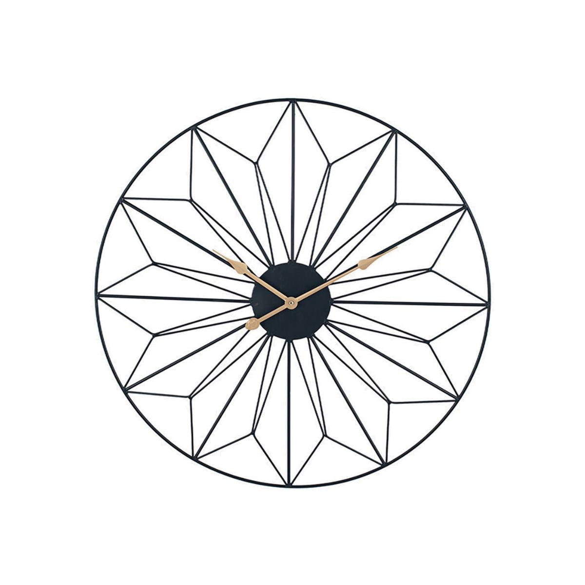 I love this round wall clock for adding a modern, architectural touch to a variety of interiors. Its geometric metal design makes it a statement piece that works well in contemporary and industrial spaces, but it can also complement minimalist decors when paired with neutral tones. Practical styling tips include placing it above a console table or sofa for visual focus, or mixing it with textured materials like wood or concrete to enhance its edgy look. Because of its open frame, it’s ideal for spaces where you want to maintain a sense of lightness and openness while still providing functionality. Keep accessories minimal around it to let the clock’s design truly stand out.