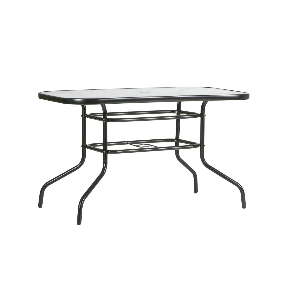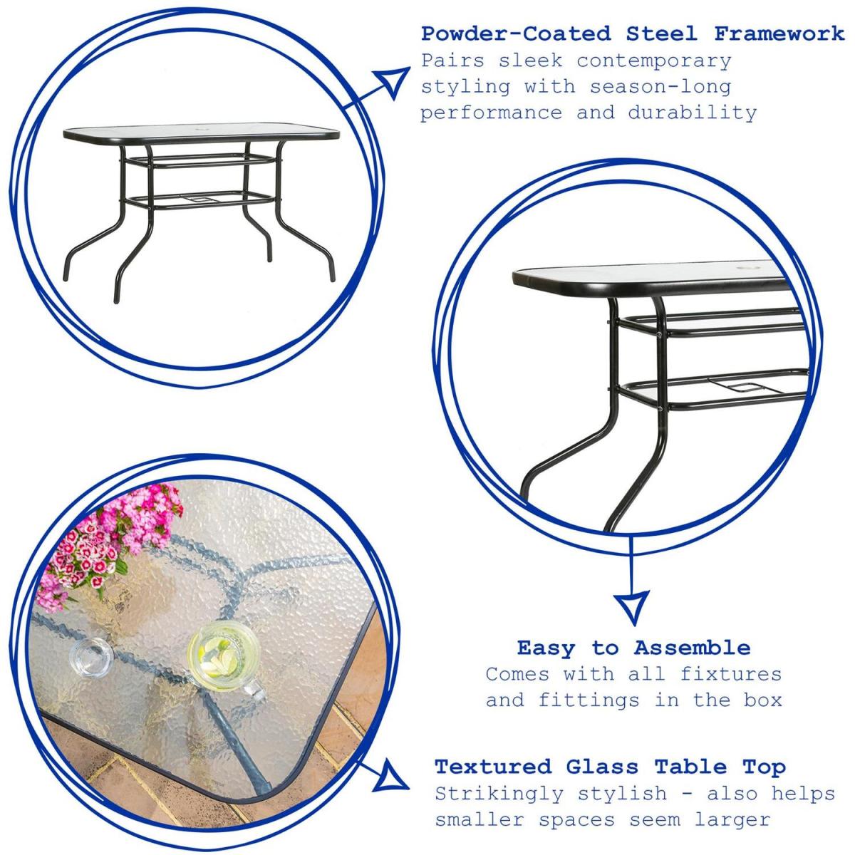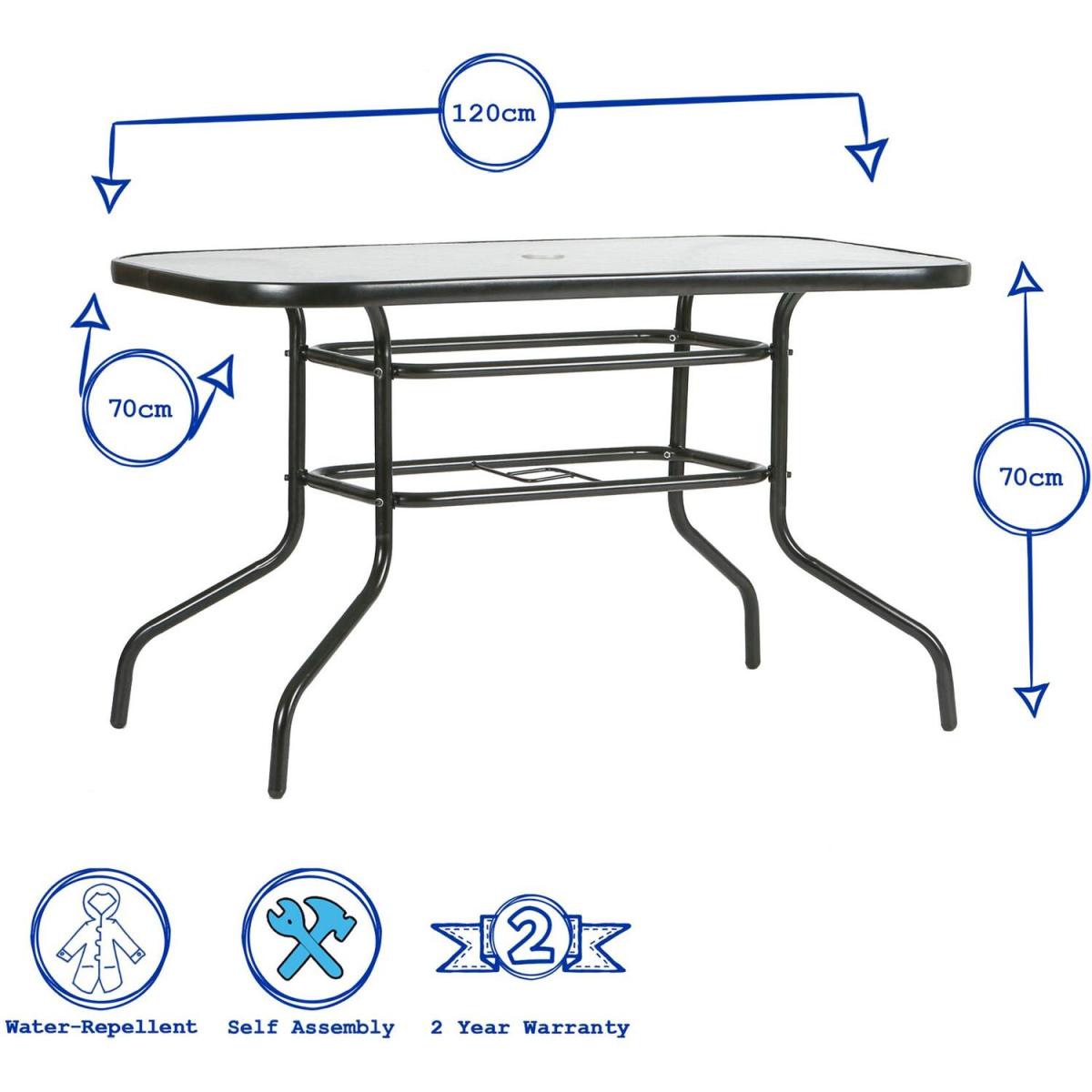 This Harbour Housewares Glass Top Garden Table lets you transform your garden, patio or balcony into your very own trendy inner-city coffee bar or bistro, with a sleek, contemporary design built for basking in style beneath the Great British Summer sun!The powder-coated metal framework offers season-long strength, support and stability while keeping everything light enough to move and manoeuvre with the minimum of fuss. The stylistic centrepiece, however, is undoubtedly the top a layer of tempered, textured glass that dances in the light to cast intricate reflections on the floor below. The use of glass also helps the surrounding area feel larger by keeping the maximum amount of floorspace visible - perfect for balconies or smaller patios!As a final piece de resistance, we've fitted each table with a parasol hole that allows you to quickly adjust and adapt to whatever surprises the British weather might spring!