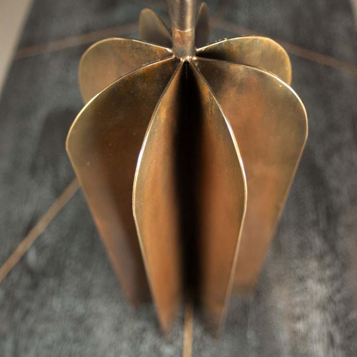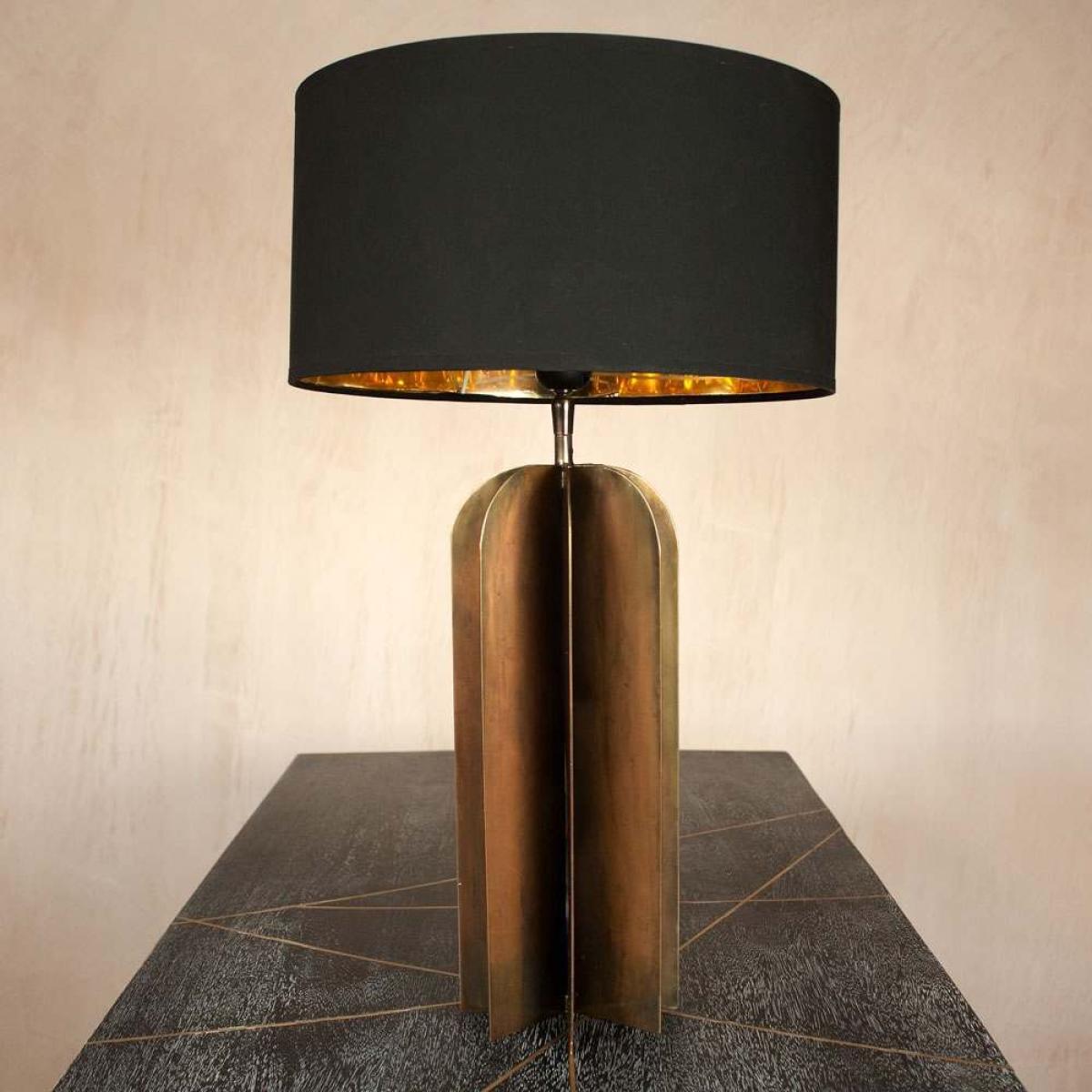 A striking metal table lamp with an antiqued brass finish, handmade in India by talented artisans.