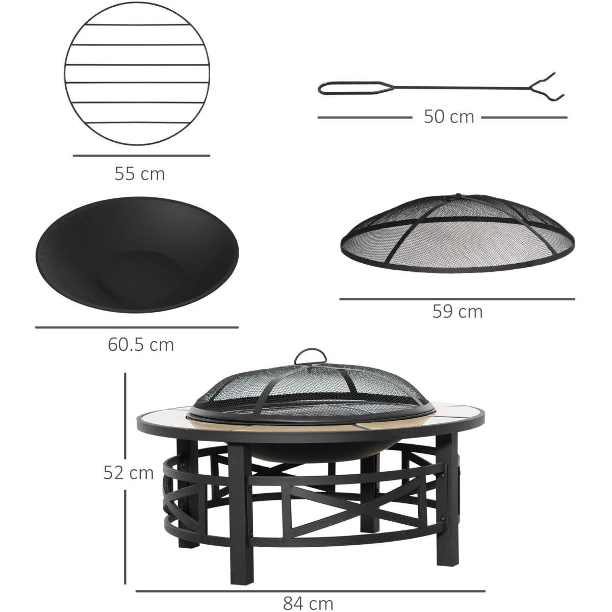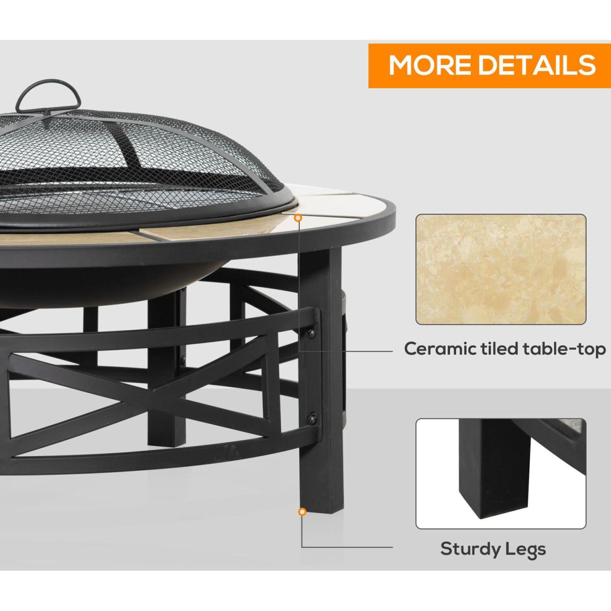 Metal Large Fire Pit, Outdoor Firepit Bowl with Grill, Spark Screen Cover - Black Frame, Light Yellow Tabletop