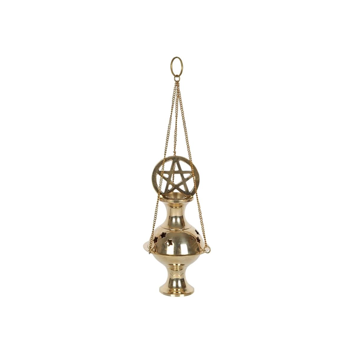 This shiny, brass incense censer features a pentagram symbol, star cutouts on the lid and a convenient chain for hanging. Simply place an incense cone or resin inside to cleanse the home with its soothing fragrance. 27cm tall including chain.