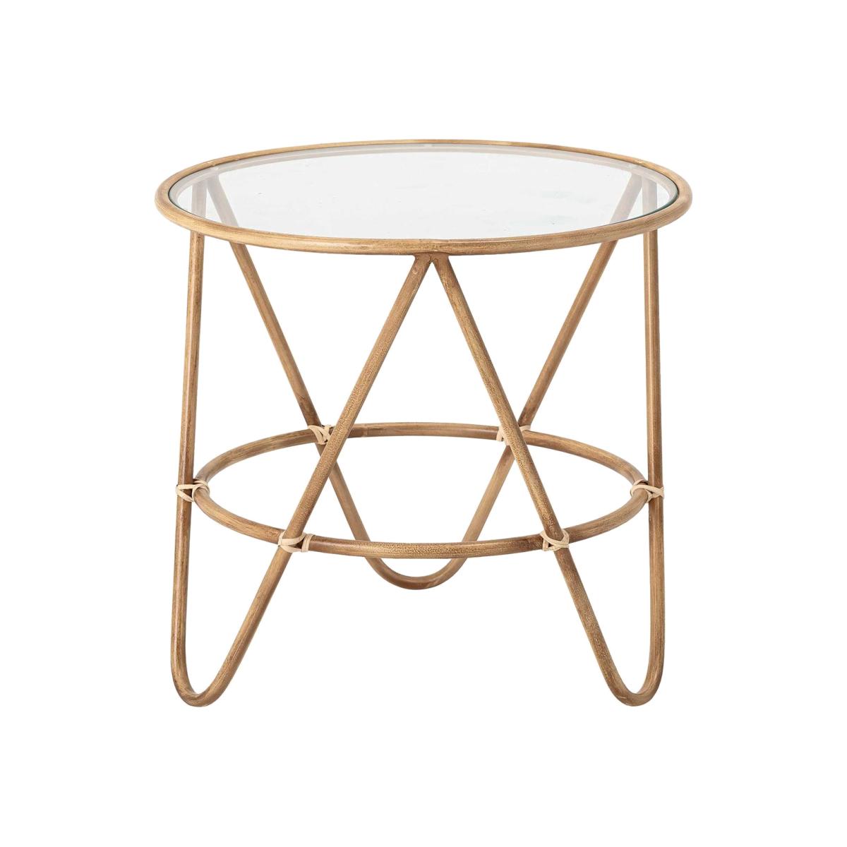 Design. A luxe twist on a natural material, the Metal Side Table features a gold metal frame with an imitation bamboo effect. Keeping up the act, real rattan ties decorate the legs, appearing to hold the design together. A glass top offers modern practicality, while the antique gold finish is incredibly on trend. A simple yet stylish piece, this round gold side table looks just as good in the living room as it does in the bedroom.
