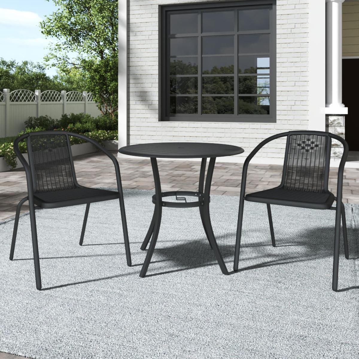Enjoy a refreshing morning or evening around our Metal Slatted Coffee Table while chatting with friends. Crafted from durable metal with an anti-corrosion coating, this table is designed to withstand the elements whilst retaining its sleek look. Ideal for those who favour texture and style over minimalism, it brings a sophisticated touch to any outdoor space. The table also features a central parasol hole, making it easy to add an umbrella for protection against sun and wind. Included are two rattan chairs, made from weather-resistant PE rattan and supported by a rustproof metal frame for lasting durability and stability.