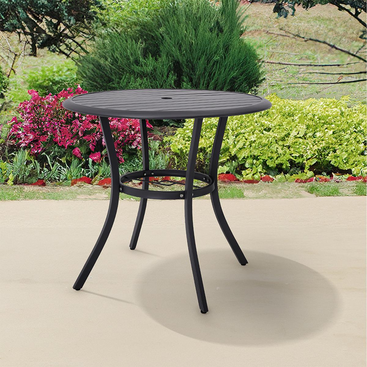 Create a warm and welcoming space with this versatile table, perfect for intimate dinners or casual gatherings. Its sleek, easy-to-clean surface and modern design make it a stylish addition to any room. With removable legs for effortless cleaning and a durable structure, it promises both convenience and stability. The added parasol hole allows for quick umbrella setup, making it ideal for both indoor and outdoor use. Metal Slatted Garden Table with Parasol Hole - Dark Grey / 1 Round Garden Table