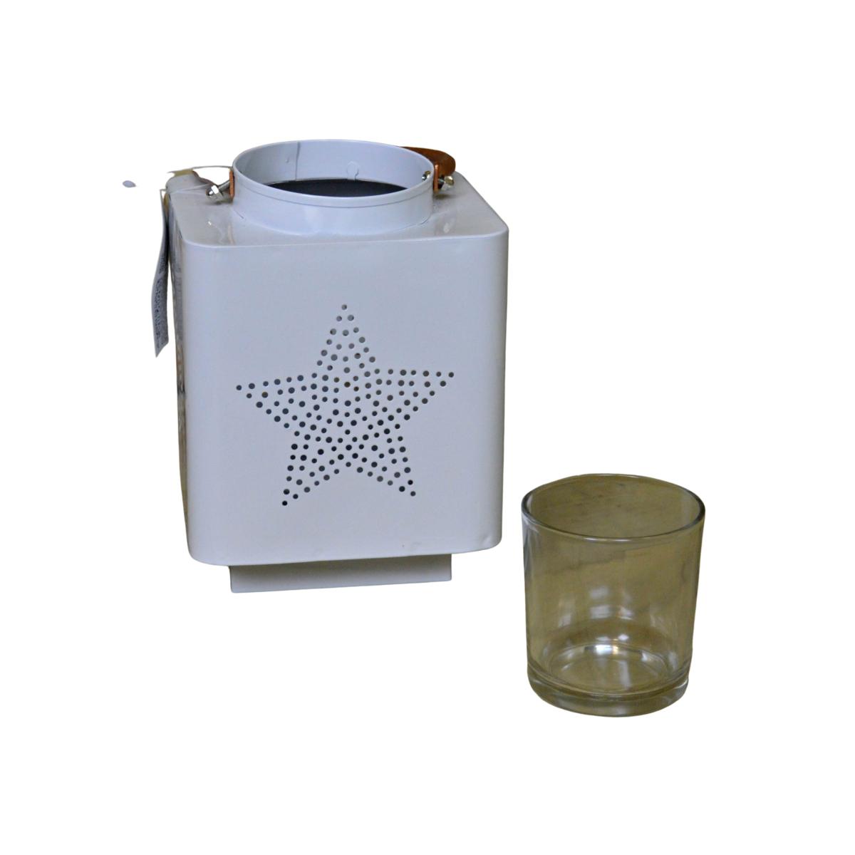 Metal Star Design Lantern With Glass Candle Pot and Copper Handle - White