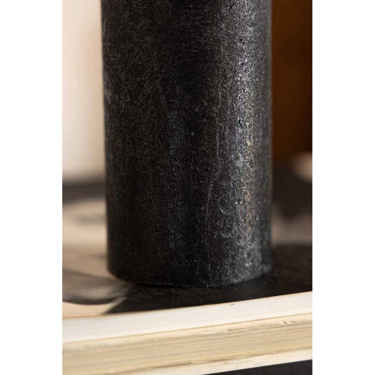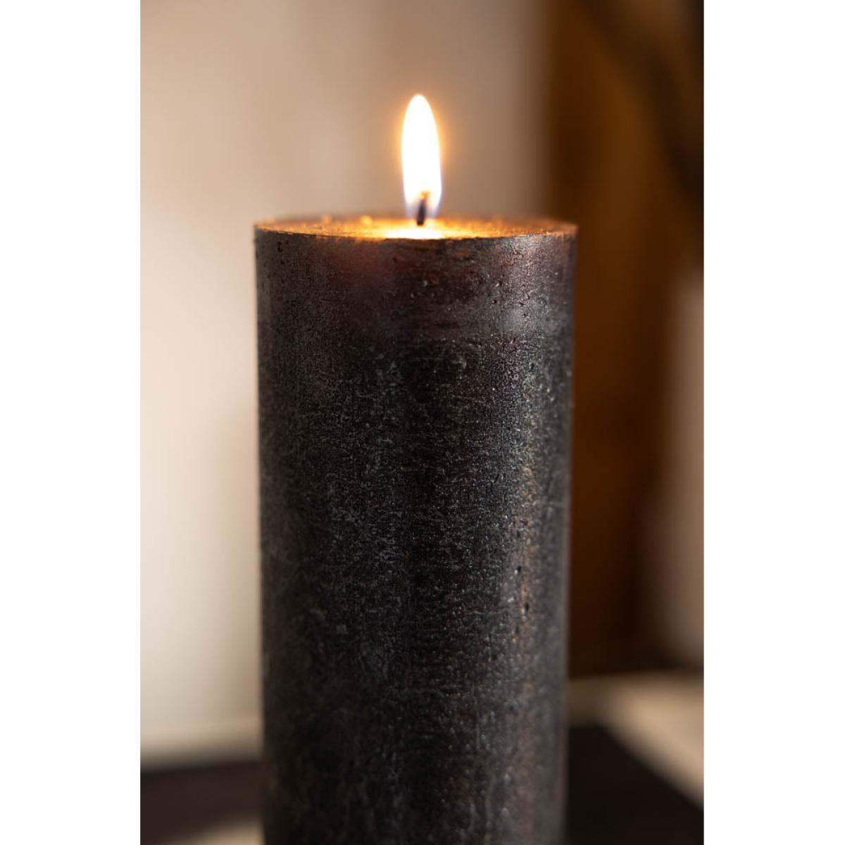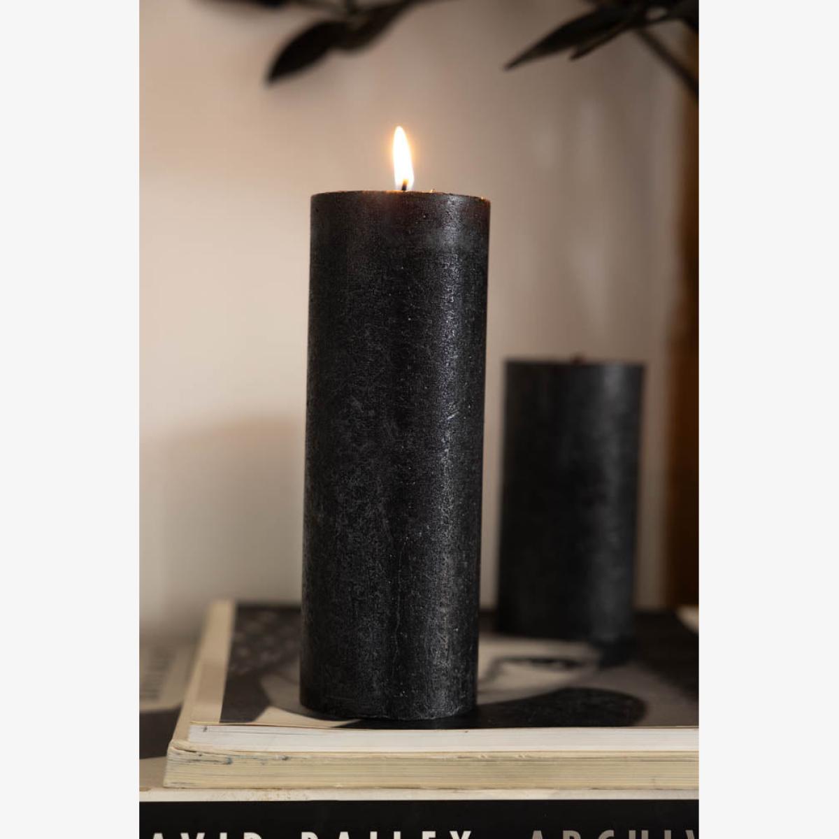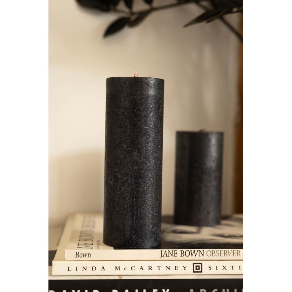 Soft black pillar candle with a subtle metallic shimmer Made with 25% plant-based wax Palm oil free Burns for up to 85 hours Also available in a medium size Please note that the colour of the candle wax is a pale grey Never leave candles unattended in your home