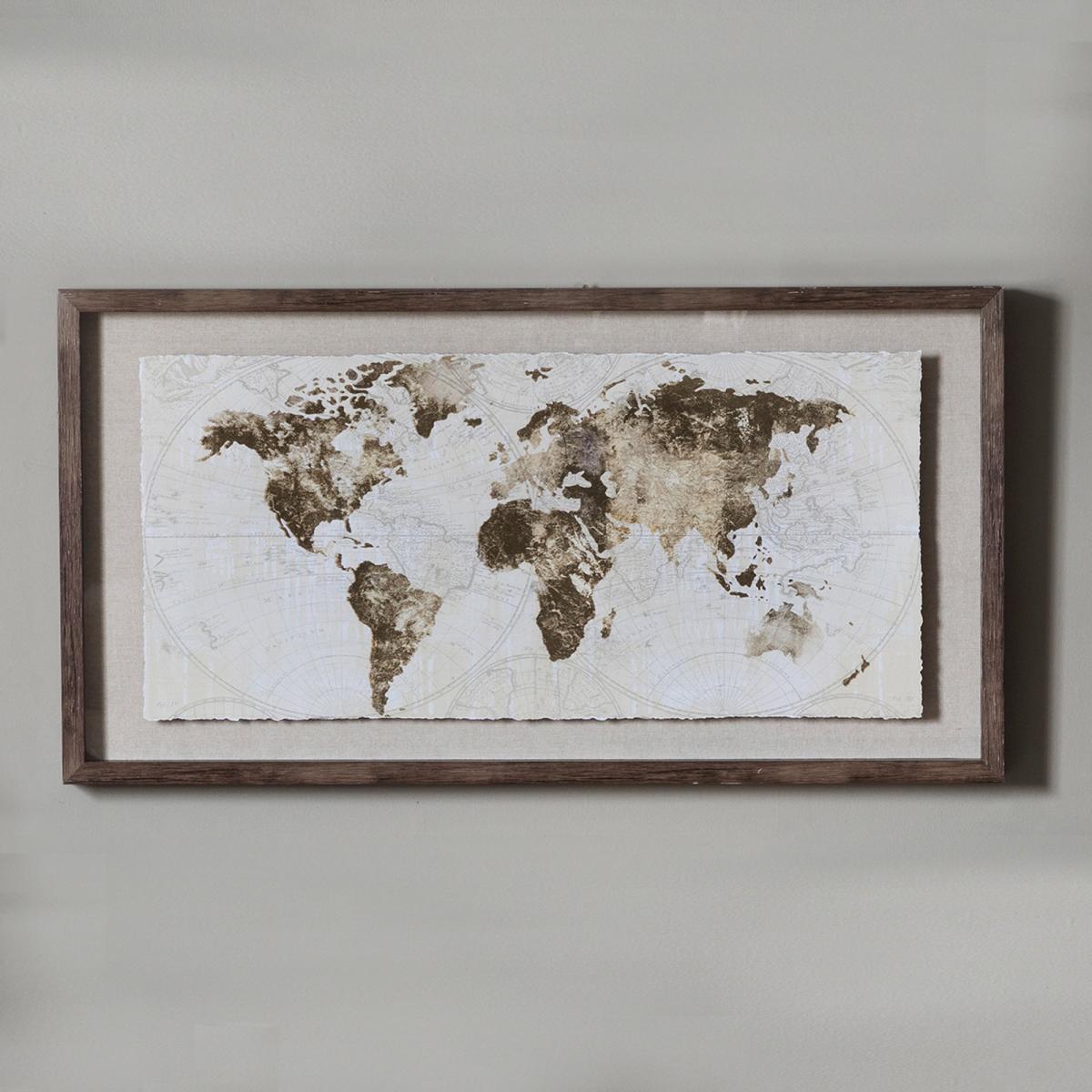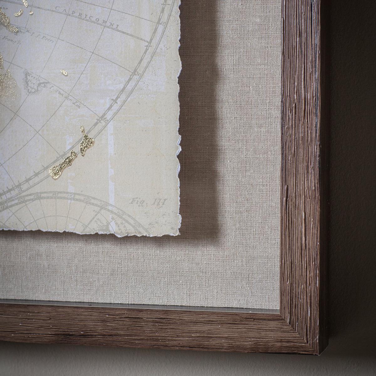 A timeless classic vintage style world map print with gold foil detailing, featuring a hand torn edge and natural linen background accented by a dark wood tone frame. This piece will make a wonderful addition in any home. Hang your new frame using our helpful top tips, click. Here. To view.