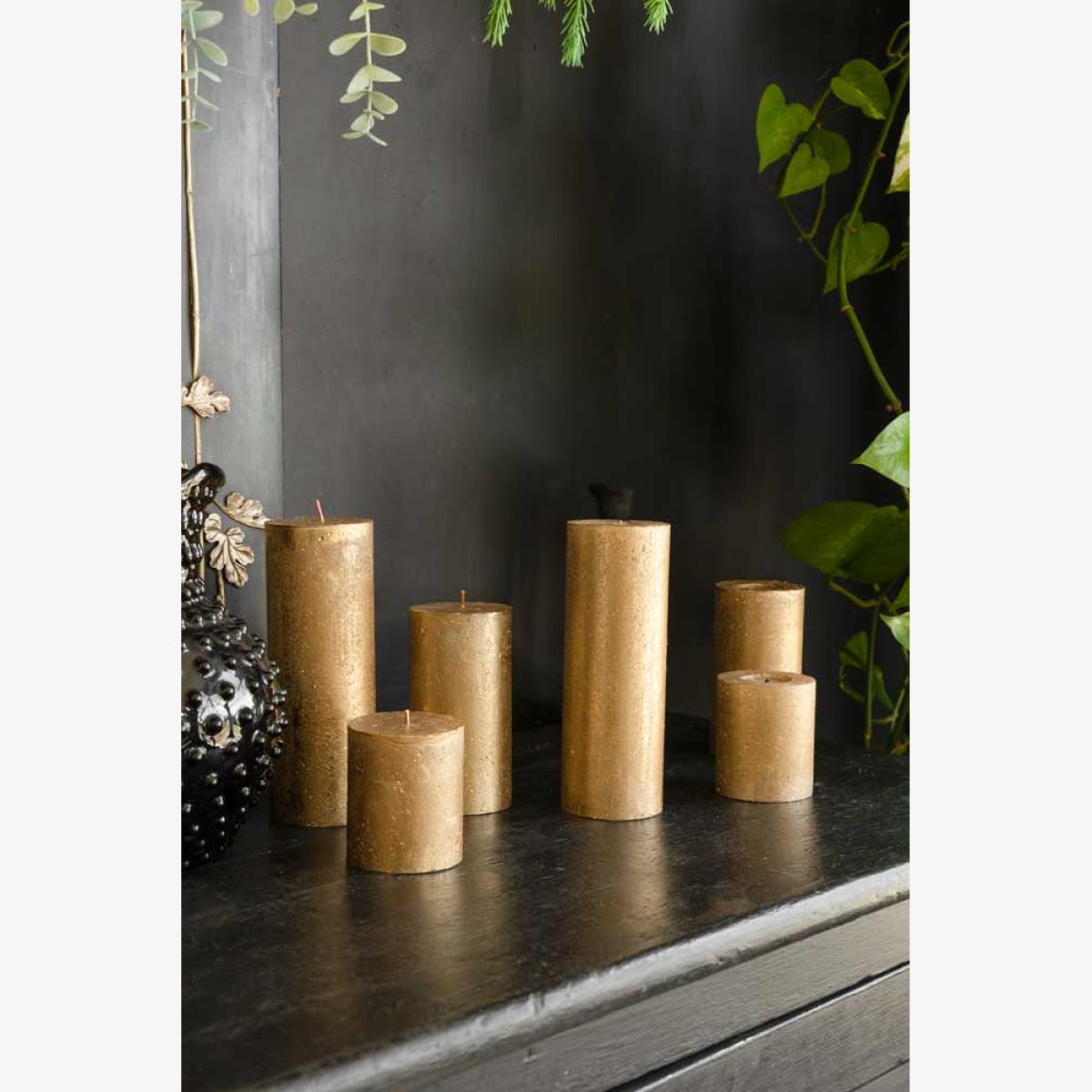Metallic gold pillar candle Made with 25% plant-based wax Palm oil free Up to 60-hours burn time Also available in small & large Please note that the wax burns white Candles must never be left unattended in your home