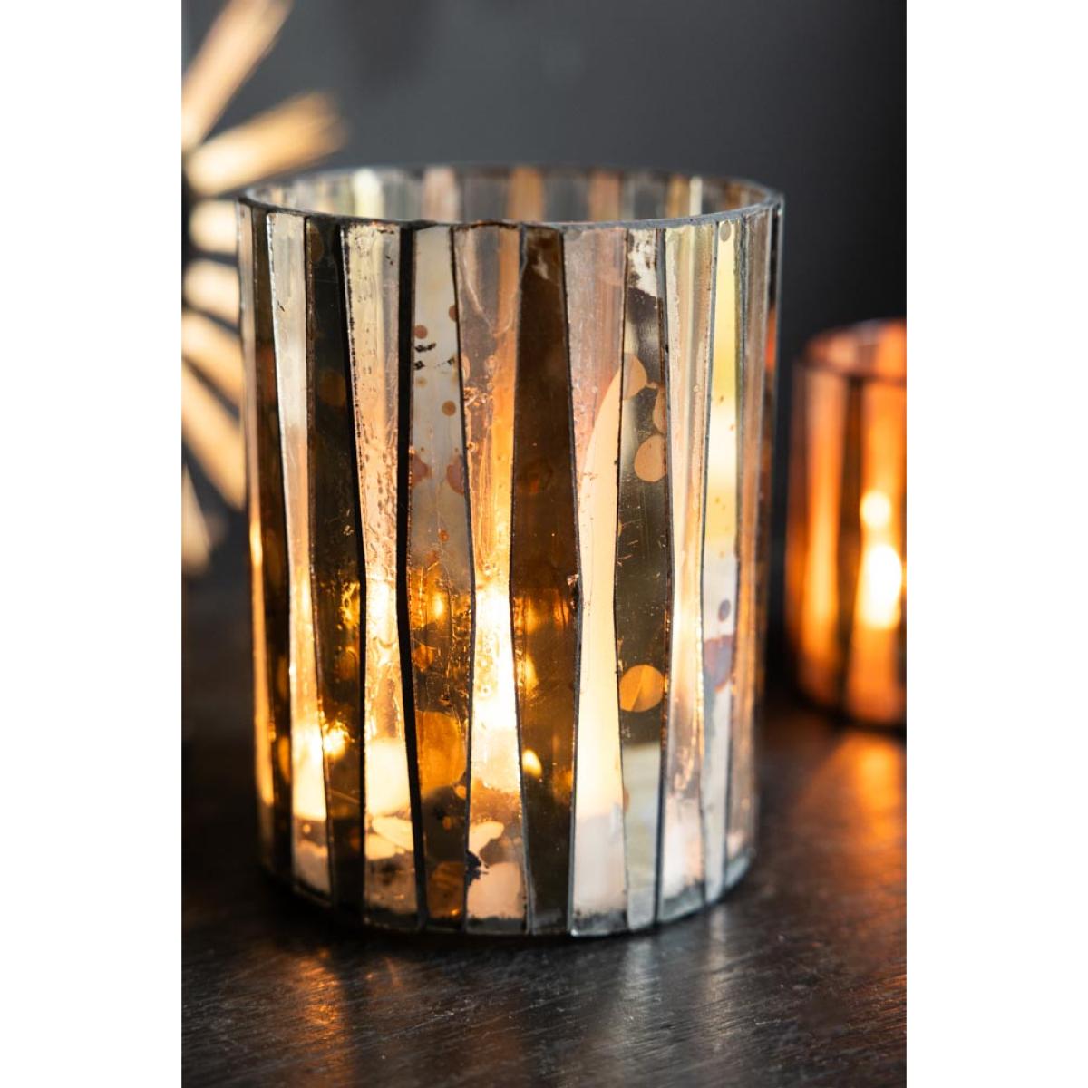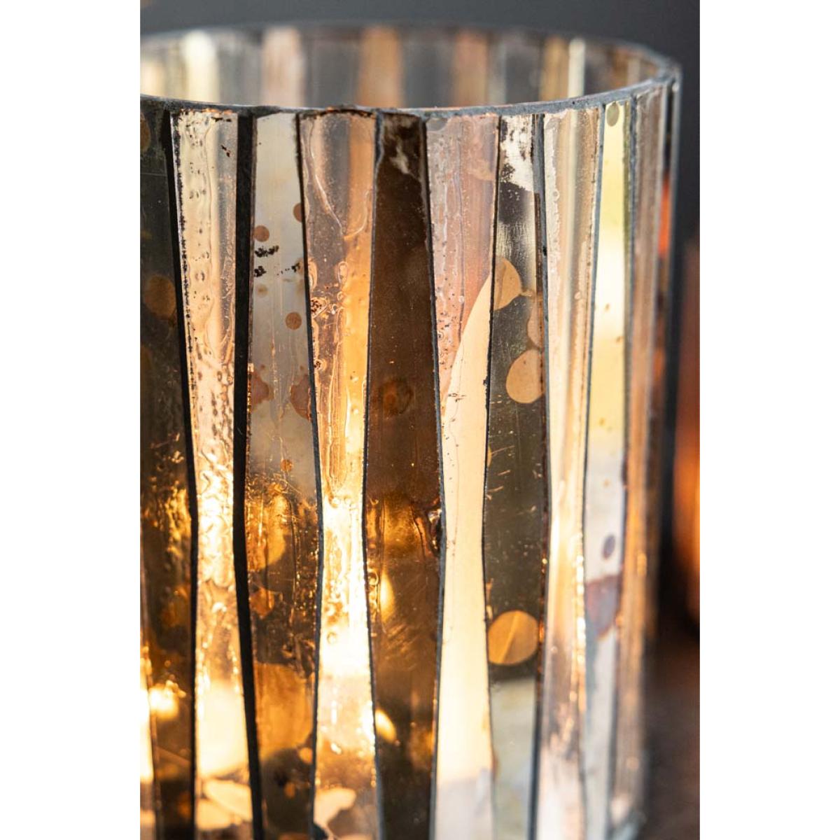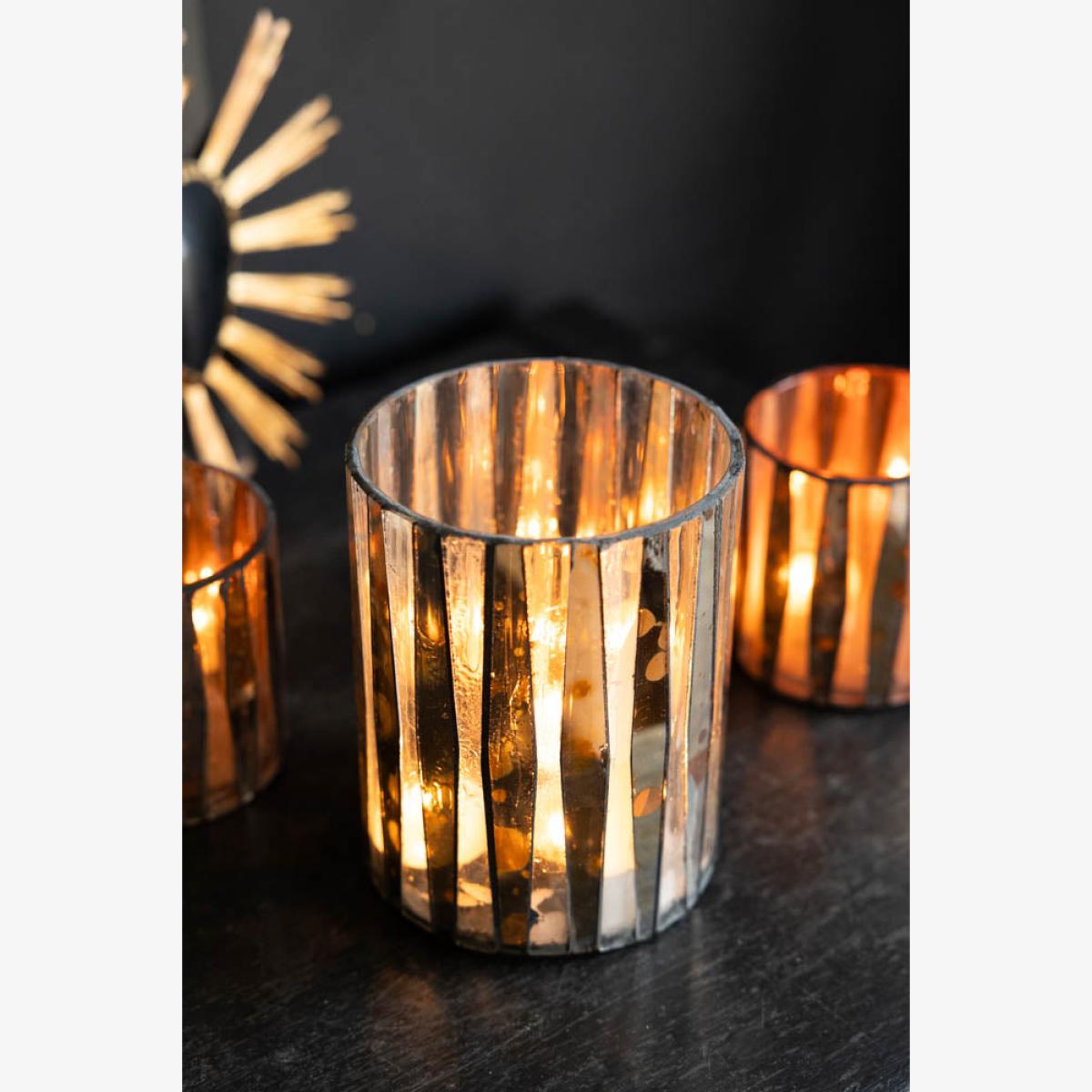 <!--td --> Enlighten your home accessories with rustic charm using our Metallic Mosaic Effect Glass Candle Holder. This glass candle holder features a beautiful design with vertical mosaic stripes in earthy brown tones, accented by a unique speckled pattern, adding a captivating artisanal touch. The metallic sheen gives it a warm, vintage vibe that feels both chic and cosy. Looking to create a snug atmosphere? This glass candleholder casts a soft glow that will instantly make your space feel more inviting. Whether placed on a mantel, dining table, desk or shelf, it’s the ultimate bestie for your favourite tealight candle. Rustic, warm and elegant, the Metallic Mosaic Effect Glass Candleholder is here for those who love quirky home accessories. - Metallic Mosaic Effect Glass Candleholder - Measures: H14cm x L11cm x W11cm - Material: Glass - Clean with a dry cloth