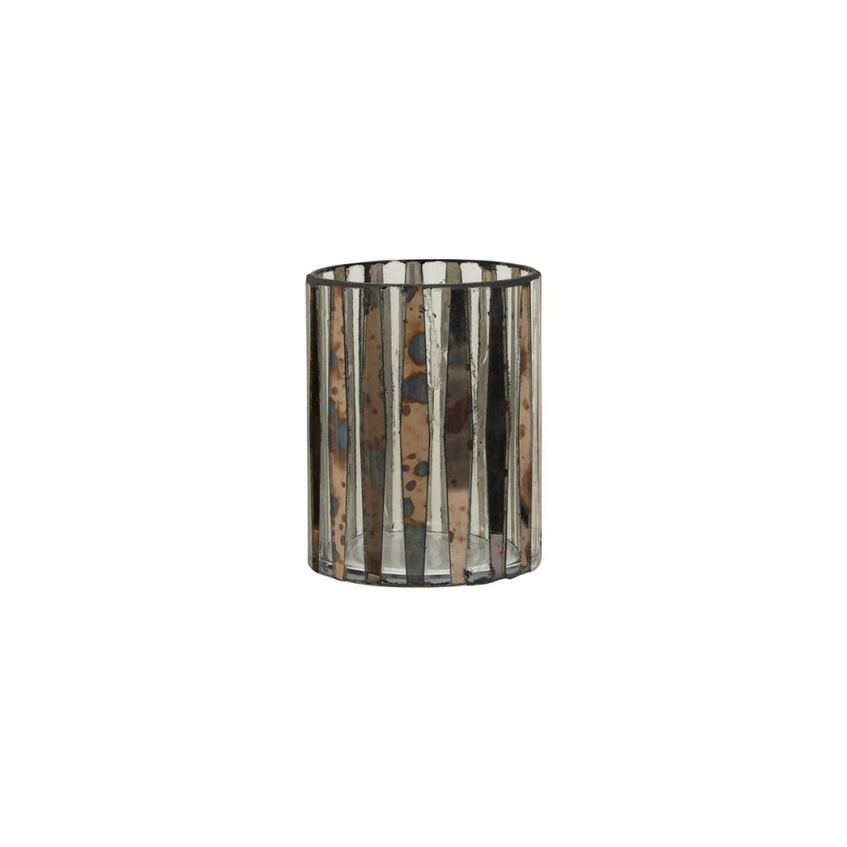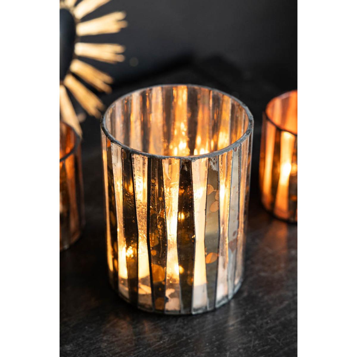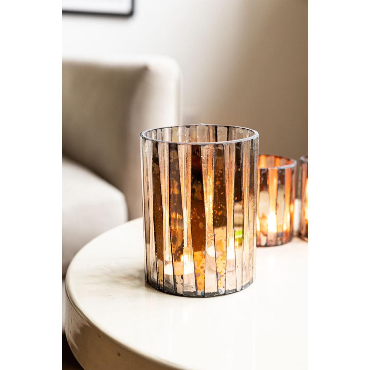 <!--td --> Enlighten your home accessories with rustic charm using our Metallic Mosaic Effect Glass Candle Holder. This glass candle holder features a beautiful design with vertical mosaic stripes in earthy brown tones, accented by a unique speckled pattern, adding a captivating artisanal touch. The metallic sheen gives it a warm, vintage vibe that feels both chic and cosy. Looking to create a snug atmosphere? This glass candleholder casts a soft glow that will instantly make your space feel more inviting. Whether placed on a mantel, dining table, desk or shelf, it’s the ultimate bestie for your favourite tealight candle. Rustic, warm and elegant, the Metallic Mosaic Effect Glass Candleholder is here for those who love quirky home accessories. - Metallic Mosaic Effect Glass Candleholder - Measures: H14cm x L11cm x W11cm - Material: Glass - Clean with a dry cloth