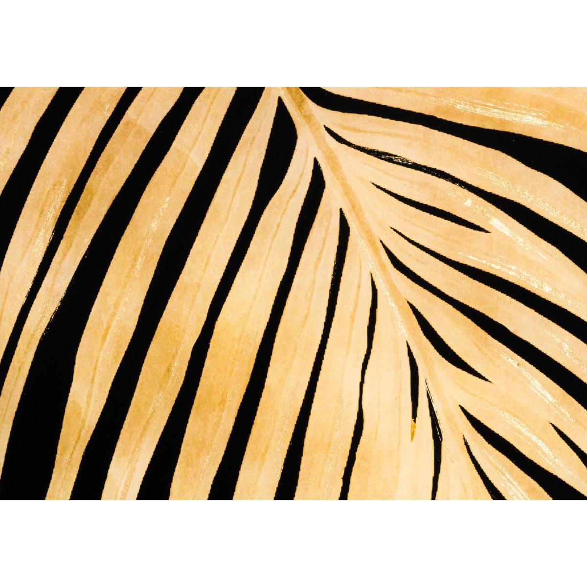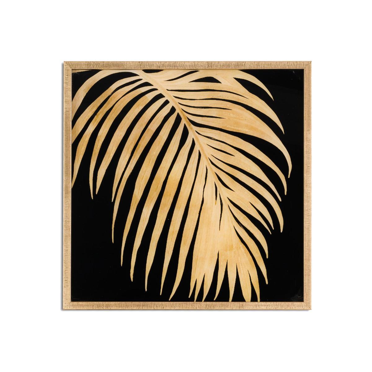 Art Deco inspired wall art for the contemporary home. The striking silhouette of a palm leaf is expertly reproduced on glass, in shining gold against inky black. Finished with a gold frame. Why you’ll love it. Bold, stylised wall art. In the decorative, Art Deco style. Silhouette of a palm leaf in gold stands out against a black background. Beautifully reproduced on glass. Finished with a simple, gold finish frame. Complements the Metallic Leaf and Metallic Cheese Plant wall art. What you need to know. Glass artwork. In a gold finish steel frame. Strong wood backing. Wall fixings and instructions are provided. Dimensions. Width: 60cm 24 inches). Depth: 4cm (2 inches). Height: 60cm (24 inches).