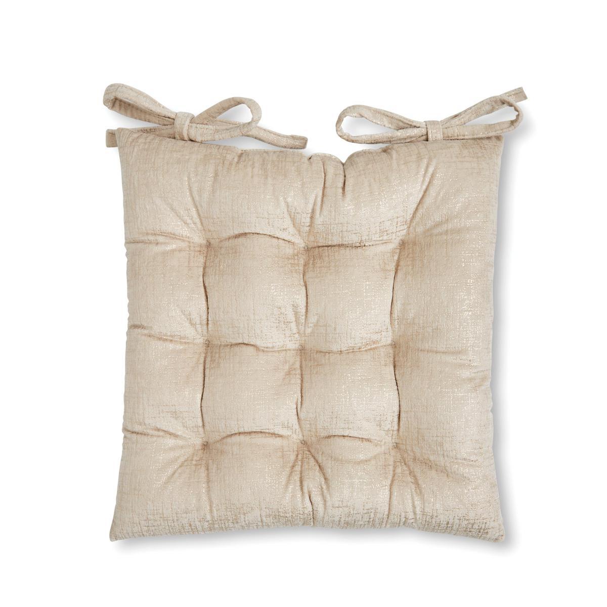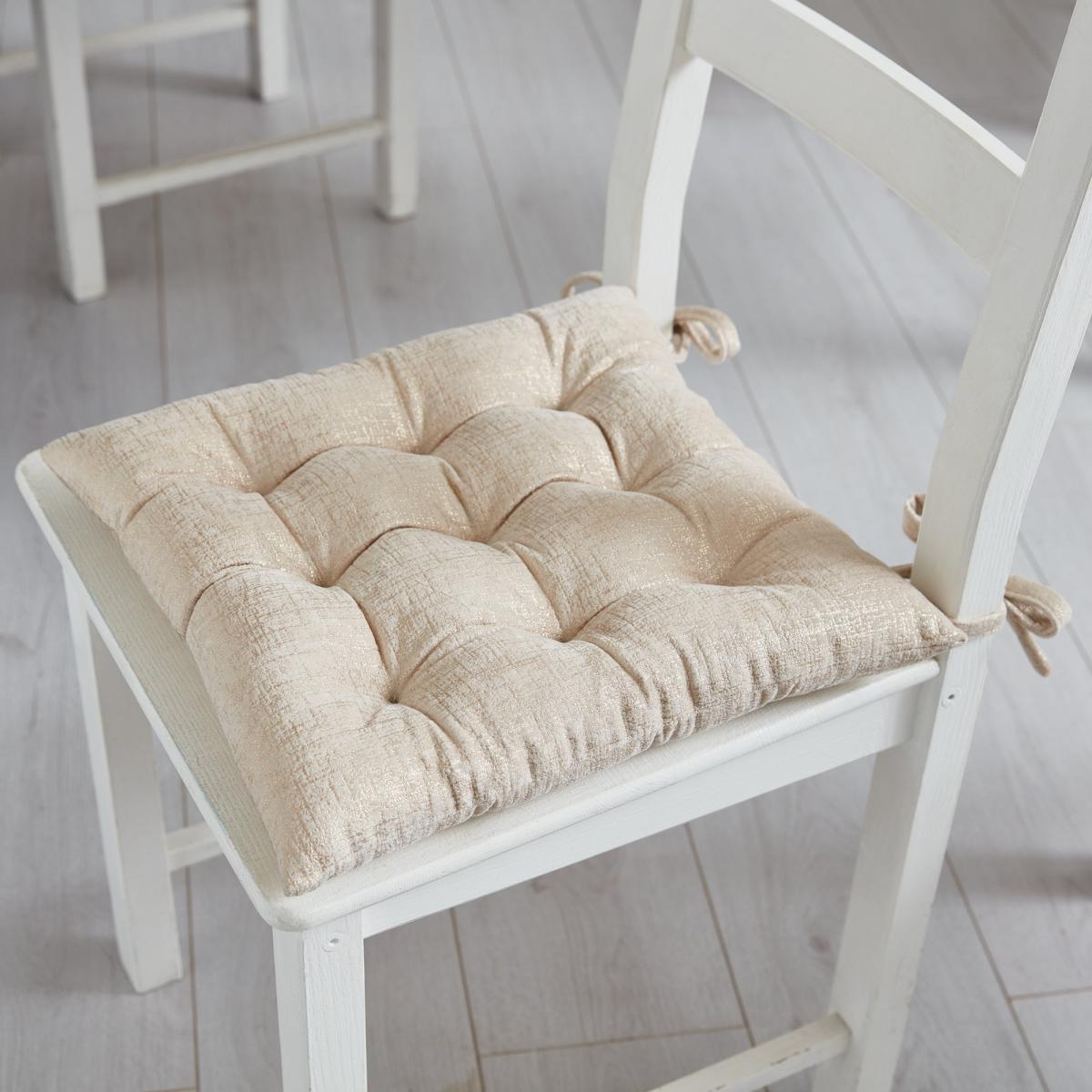 Ideal for adding a glamorous touch to any chair, this metallic seat pad in a modern champagne colourway would compliment any chair beautifully. Crafted from polyester, this seat pad is durable and easy to clean. This seat pad has ties for easy attachment.