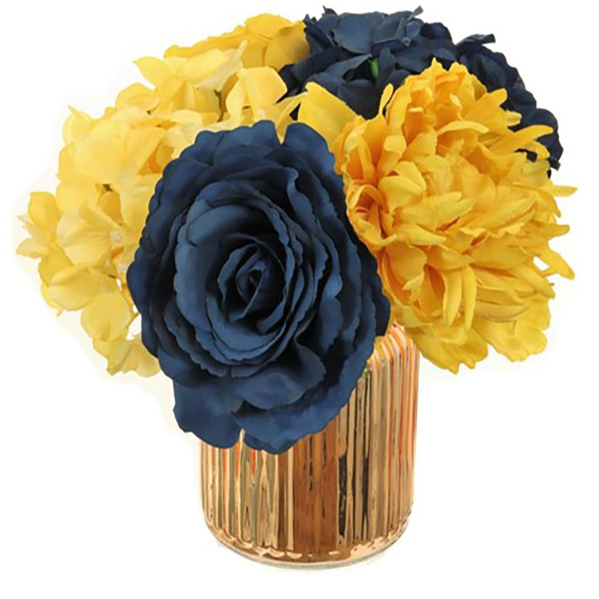 With clouds of silky flowers in fashionable navy and ochre, settled in a copper, ribbed vase, this Metallic Ribbed Arrangement will bring an elegant burst of colour to any room. Perfect for using as a centre piece on your dining table or to jazz up a book shelf, this faux bouquet is perfect for anyone who loves glamorous florals.