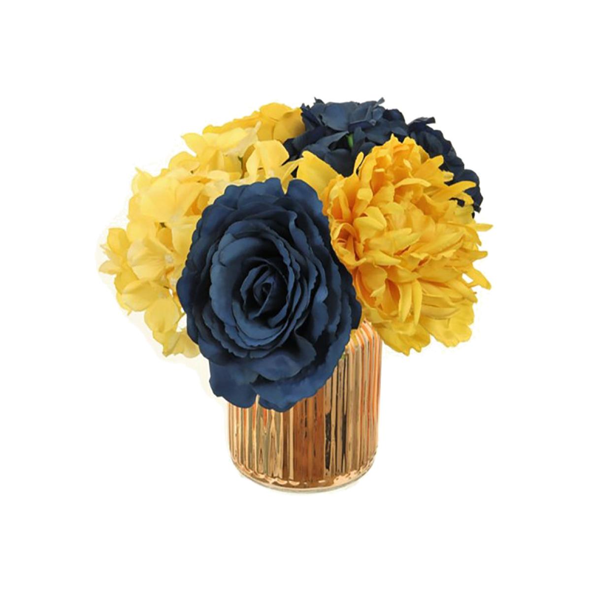 I love the metallic ribbed arrangement for its modern yet luxurious feel, thanks to the combination of bold navy and yellow blooms paired with a sleek, reflective vase. It works particularly well in contemporary and eclectic interiors, adding a splash of colour and sophistication without the maintenance of real flowers. To style it effectively, consider placing it in a minimalist space where its vibrancy can be a focal point, or use it as a centrepiece on a sideboard or console table. For added impact, group it with other metallic or textured accessories, and ensure the surrounding colours complement its striking palette. It’s a versatile piece that injects colour and elegance effortlessly.