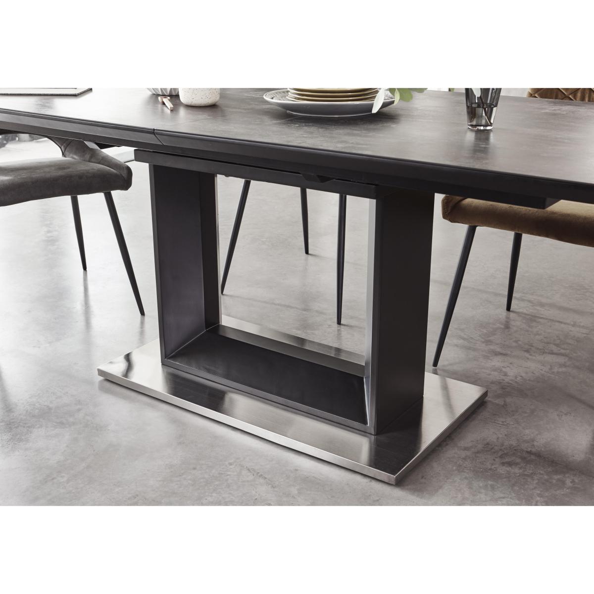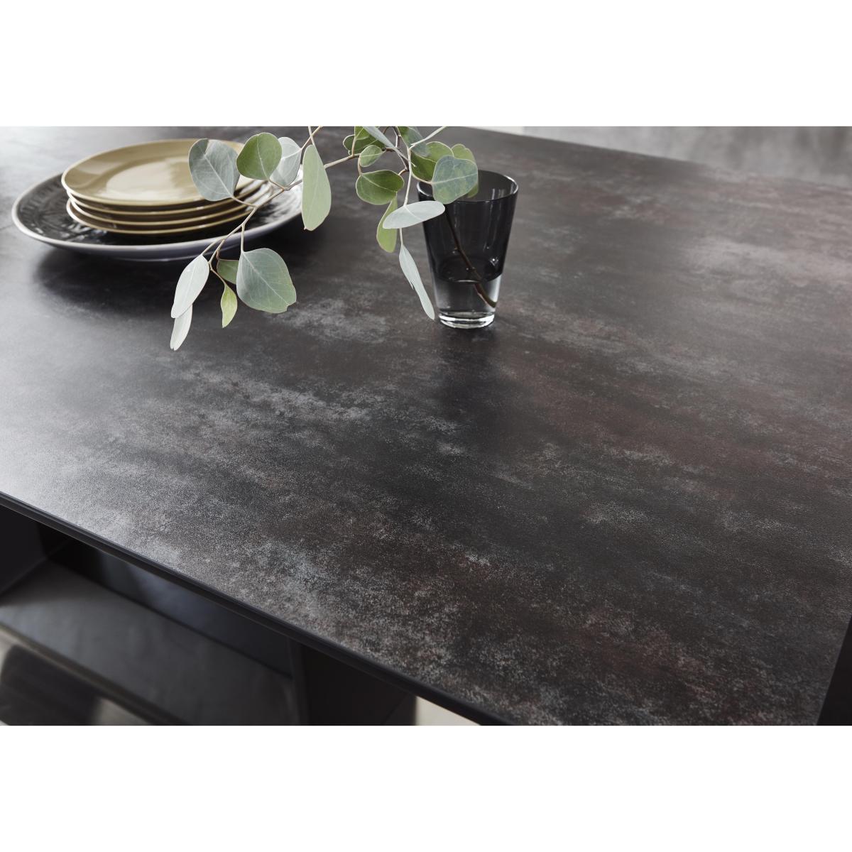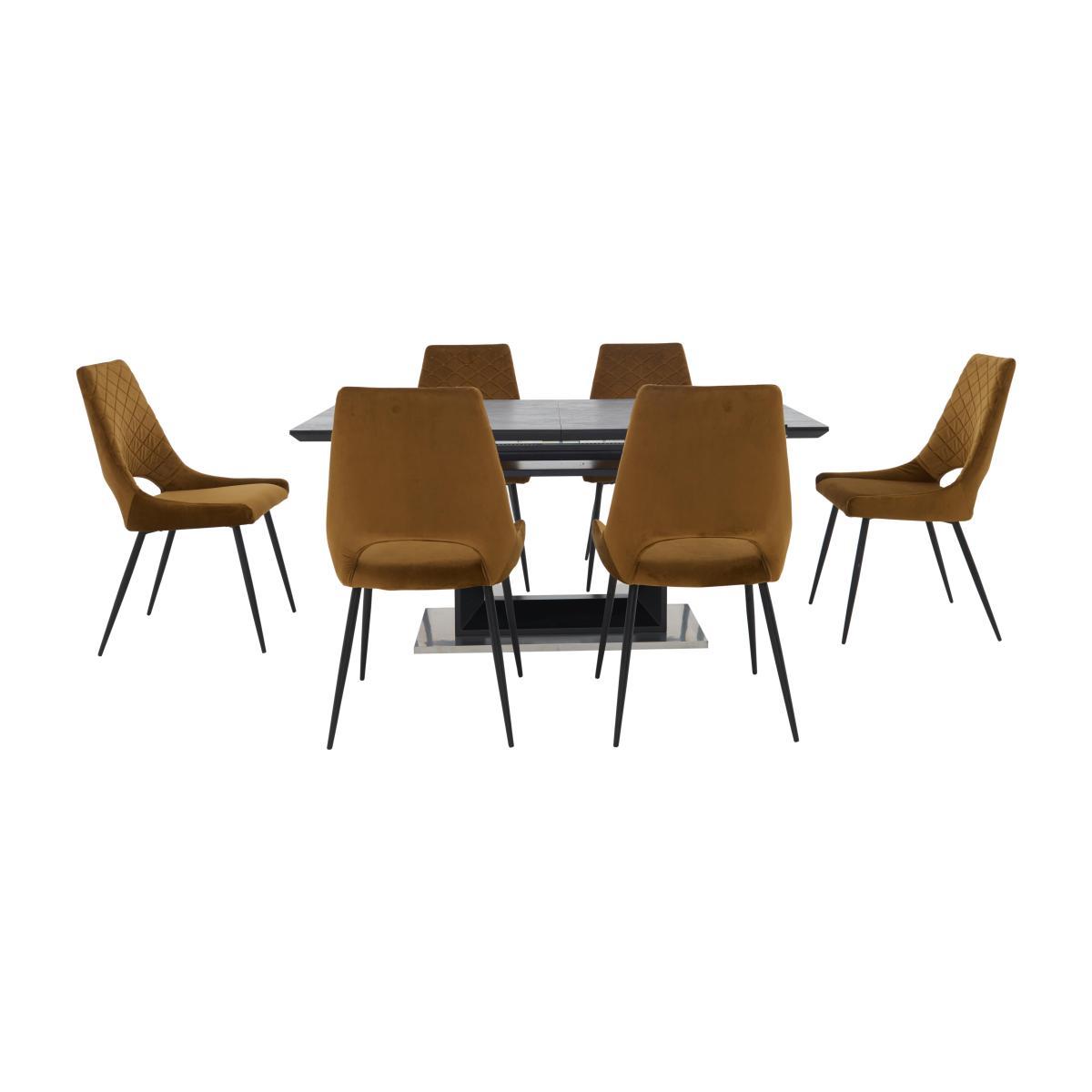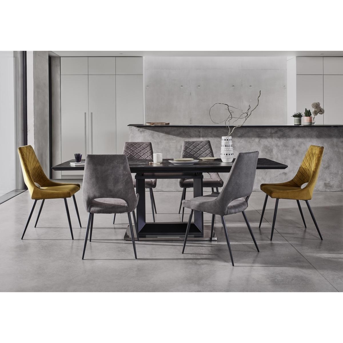 Extending dining table topped with imported Italian graphite ceramic seats 8. With 6 fabric dining chairs in your choice of grey or mustard. Stunning contemporary style – only at Furniture Village. Stylish, bold and contemporary, the Metallica extending dining table with graphite ceramic top and 6 dining chairs dining set can’t help but make a fantastic first impression. The stunning dining table is topped with graphite grey imported Italian ceramic and is set on a matt black lacquered wood base, geometric in form, which rests on a brushed stainless steel plinth. The table extends with an easy to use butterfly mechanism. It’s altogether striking. This large table is paired with six of the collection’s dining chairs. Gently retro in appearance, these curved chairs are comfortably cushioned and have feature stitching in a quilted design on the inside backs. They rest on slender black metal legs. Choose soft, vintage-effect fabric in grey or mustard velvet for all six chairs, or our stylish designer arrangement of four in grey and two in mustard. The Metallica extending dining table with graphite ceramic top and 6 dining chairs dining set is part of the Metallica collection of dining room furniture, exclusively available at Furniture Village. Did you know?. Ceramic is highly durable, and heat and scratch resistant. Each ceramic top is individually made and will have unique and distinctive characteristics. Please note. Fabric tends to fade if exposed to prolonged sunlight, and will show wear on areas of more use.