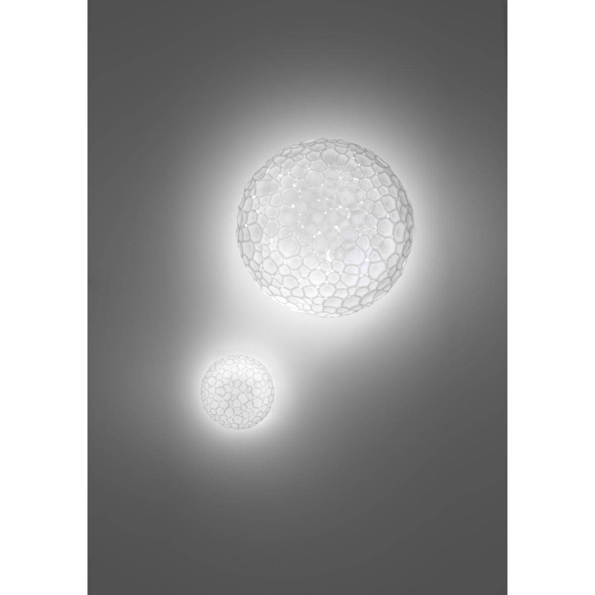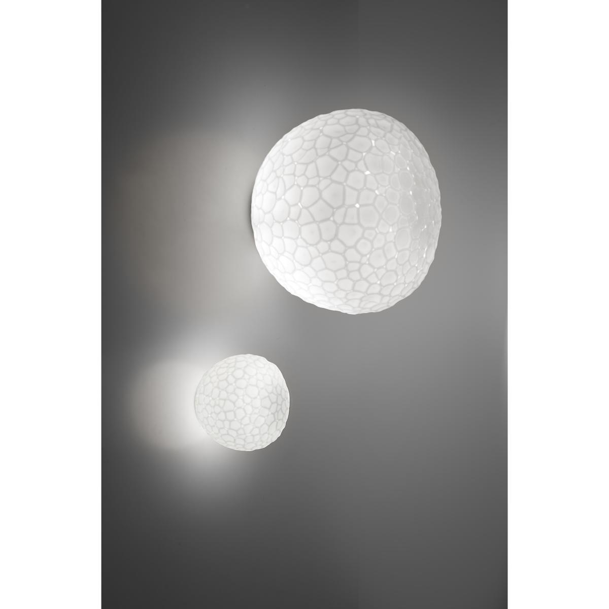 Meteorite originates from the pursuit of a new sensibility, a new expressive language for lighting blown-glass. The starting point was our fancy for Venetian “beaten” glass, for the grinding effect, and for the strong charm of the “unfinished” feel that such kind of process brings to glass. ? We designed a special glass-blowing and grinding process, which allows to obtain impressive lighting depth in the illuminated object, and to make this beauty accessible or – we might say – democratic. ” Pio e Tito Toso. A family of lamps comprised of four different types, with a double-layer artistic glass diffuser obtained by means of the craft still glass blow moulding technique followed by frosting.
