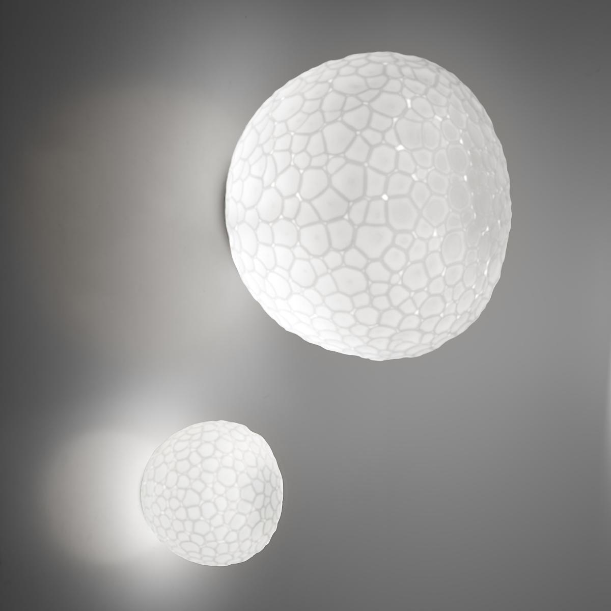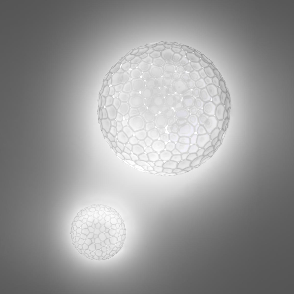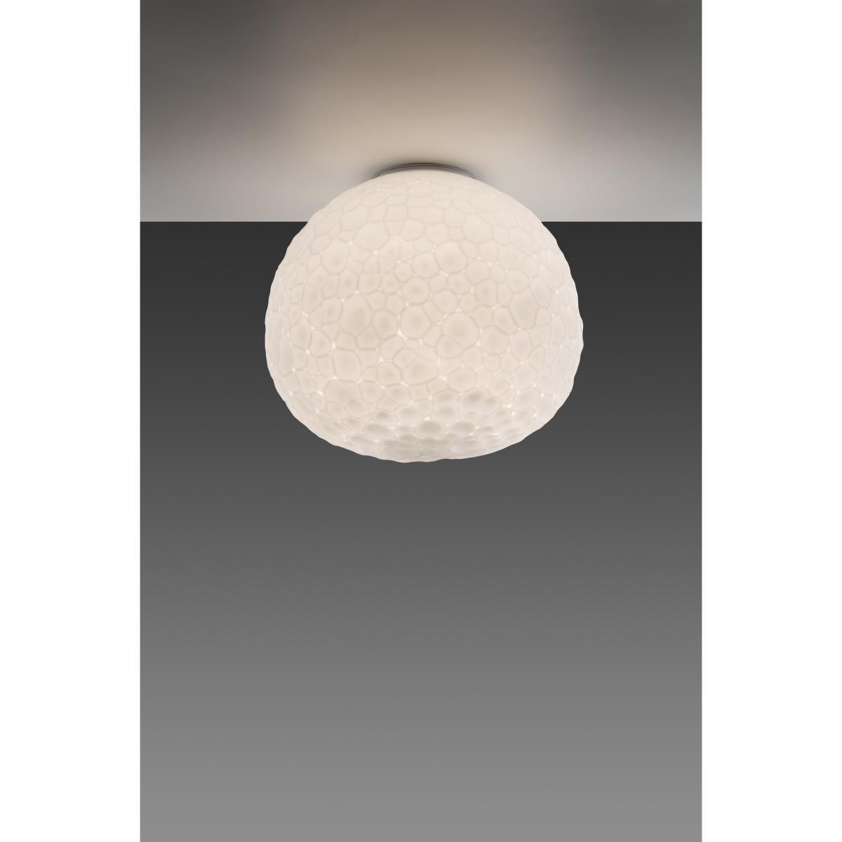 Meteorite originates from the pursuit of a new sensibility, a new expressive language for lighting blown-glass. The starting point was our fancy for Venetian “beaten” glass, for the grinding effect, and for the strong charm of the “unfinished” feel that such kind of process brings to glass. ? We designed a special glass-blowing and grinding process, which allows to obtain impressive lighting depth in the illuminated object, and to make this beauty accessible or – we might say – democratic. ” Pio e Tito Toso. A family of lamps comprised of four different types, with a double-layer artistic glass diffuser obtained by means of the craft still glass blow moulding technique followed by frosting.