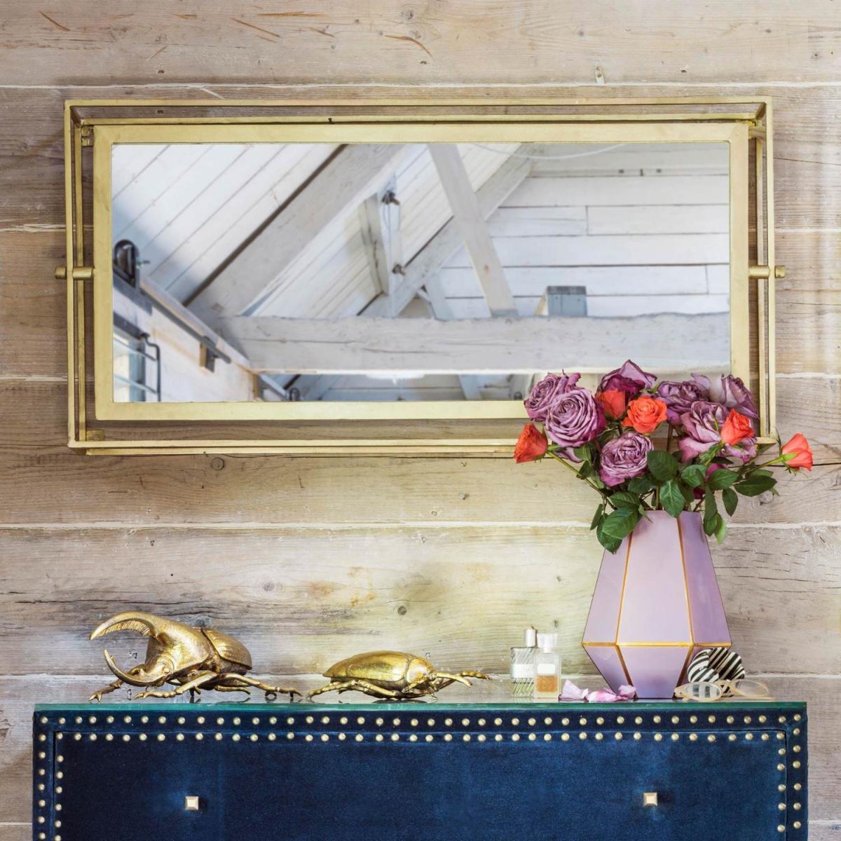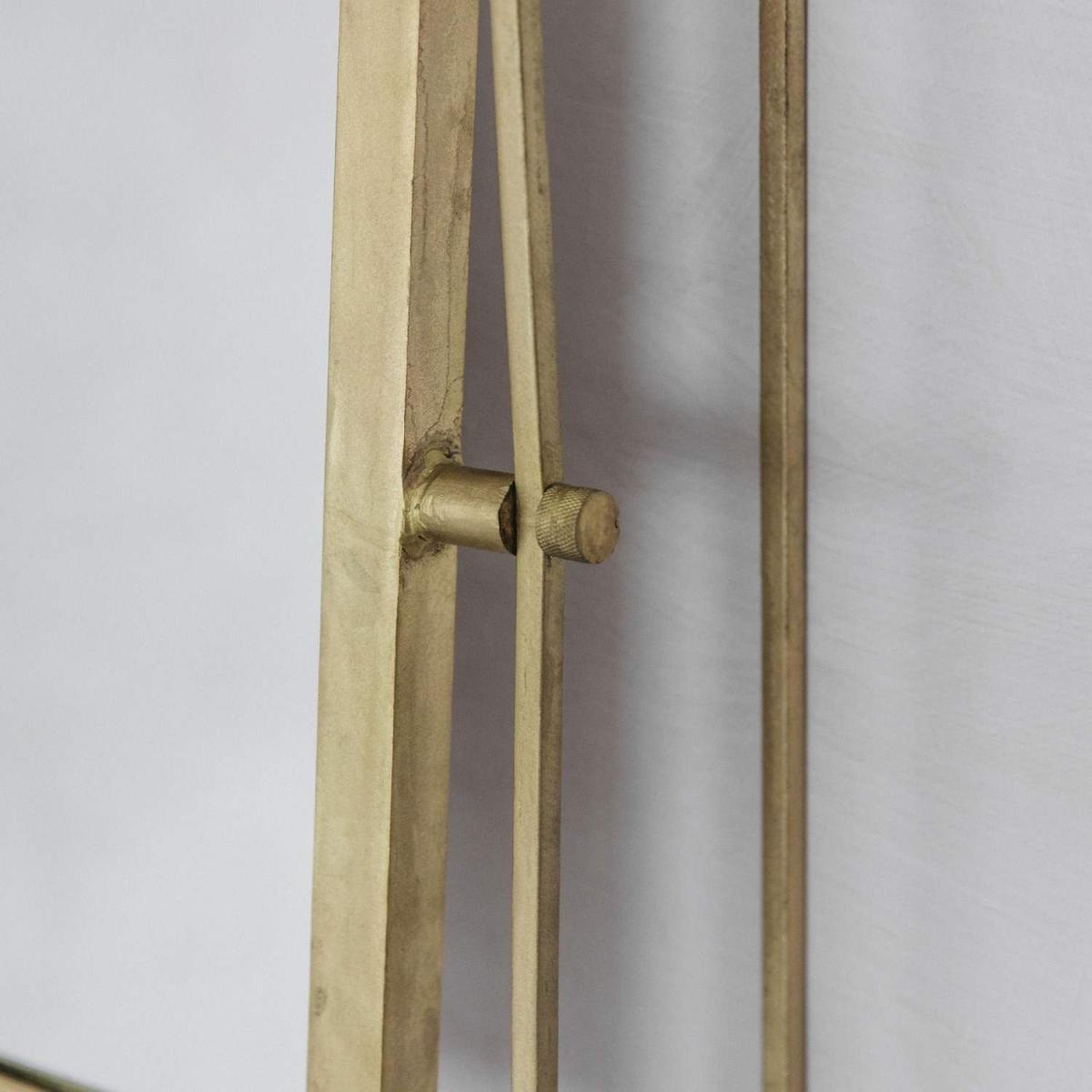 A single pivoting mirror mounted in a linear iron frame with a lacquered brass-plated finish.