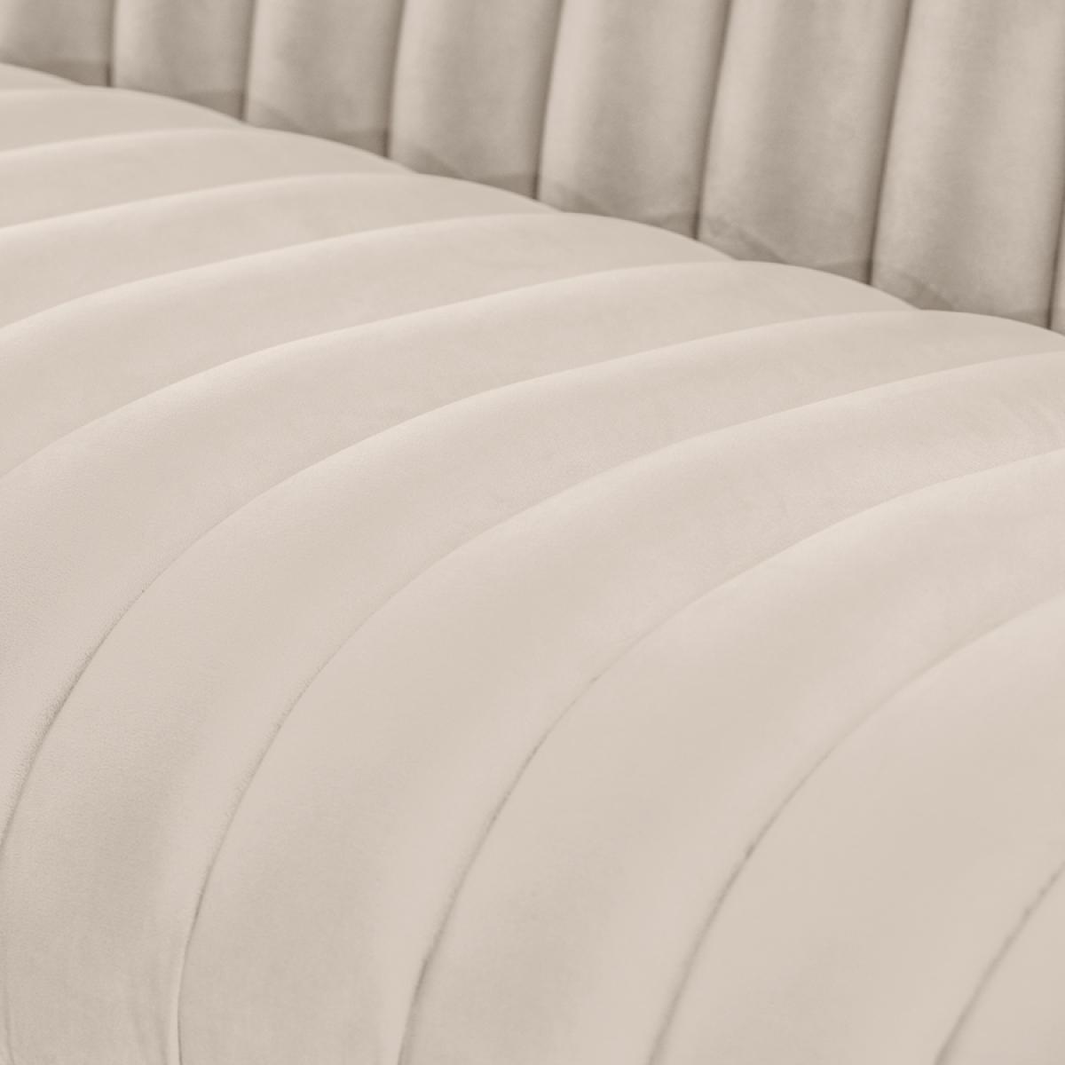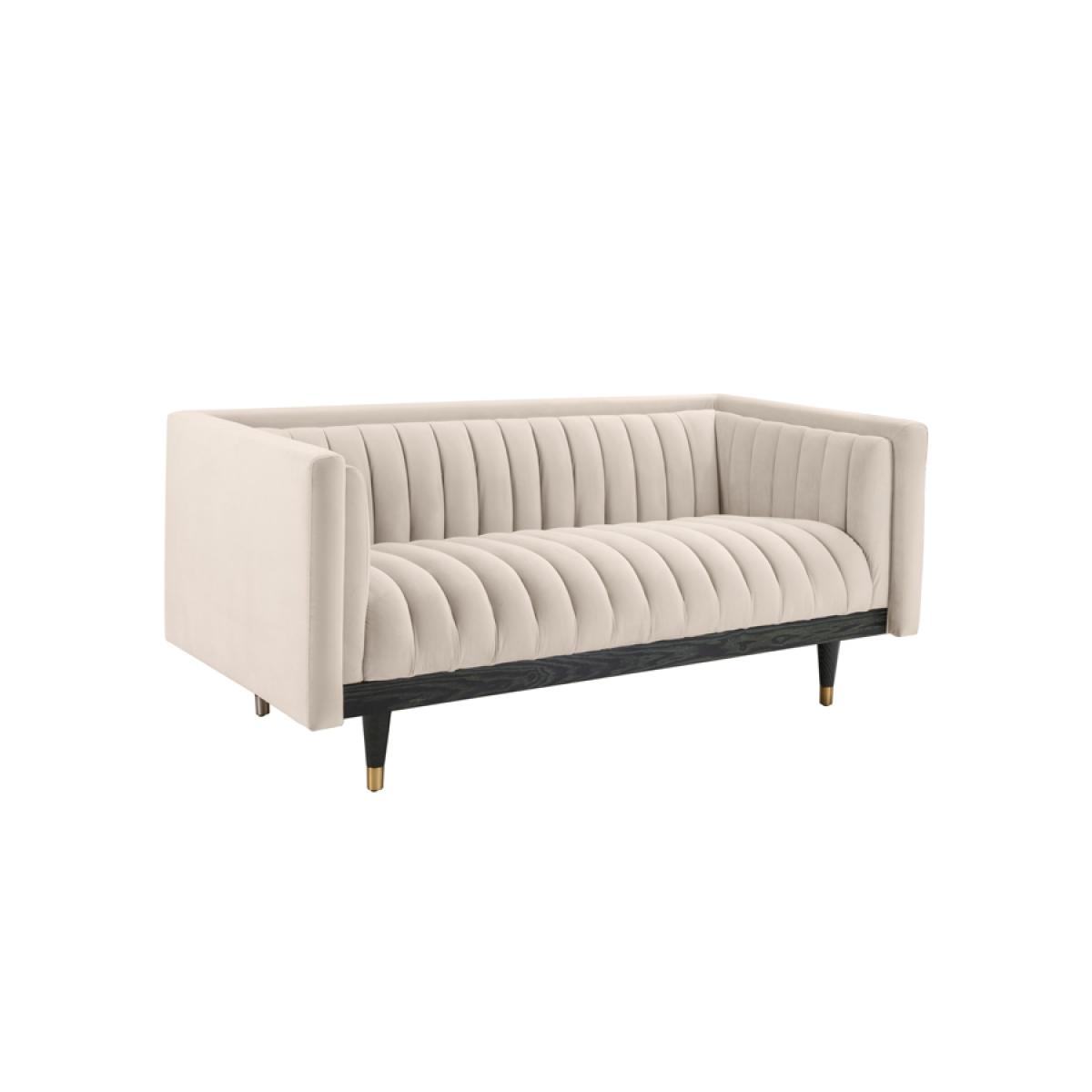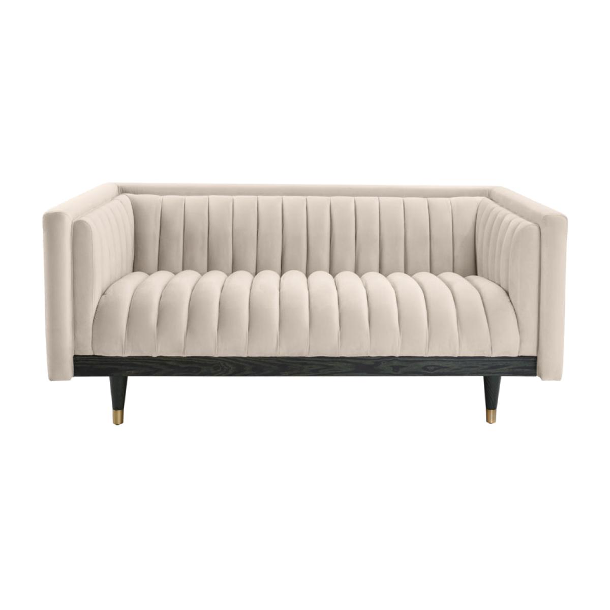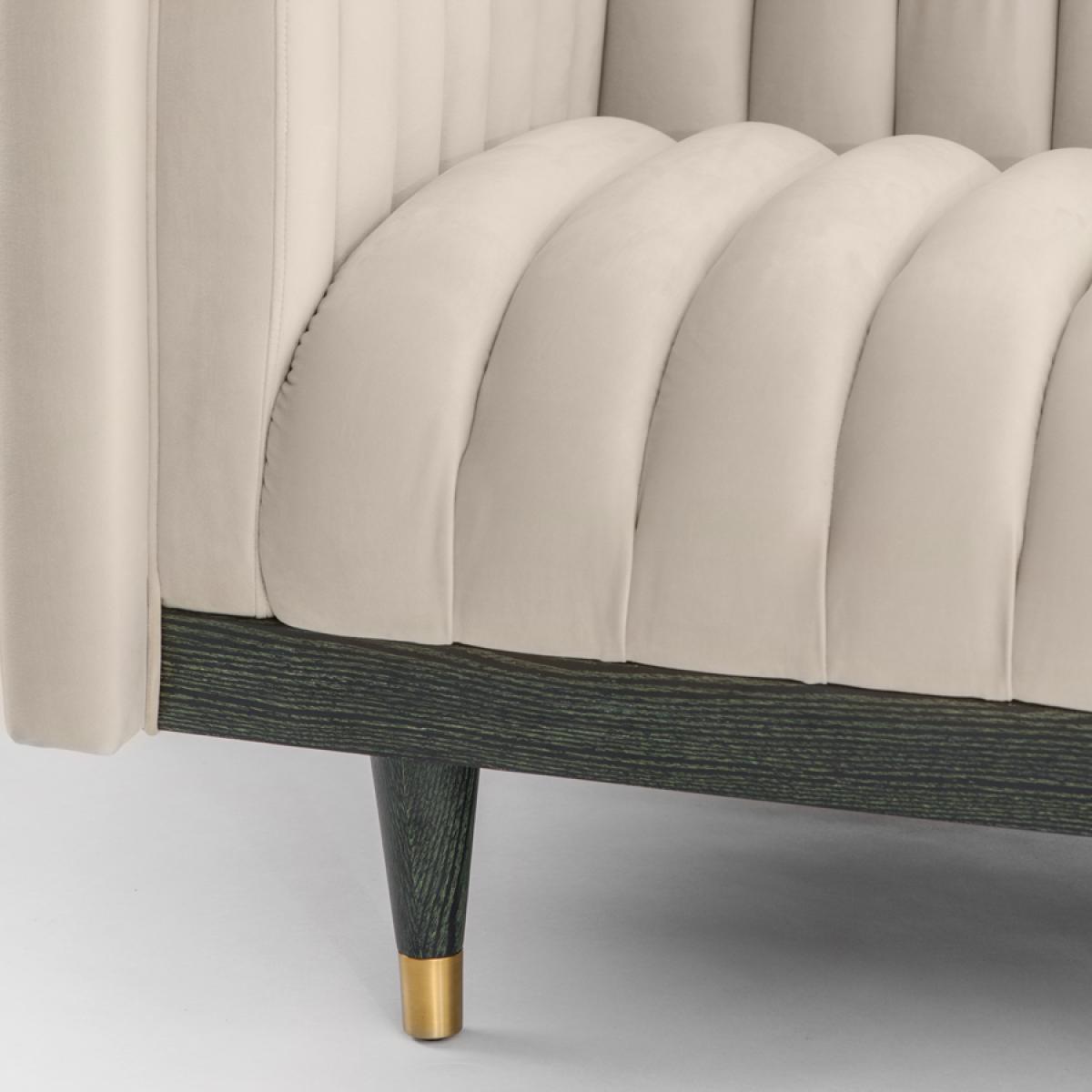 Luxurious statement sofa inspired by contemporary Italian furnishings. Distinctive deep fluted design. Very comfortable sprung seat and backrest. Solid ash base with black/green stain and brushed brass feet caps. Velvet upholstery fabric.