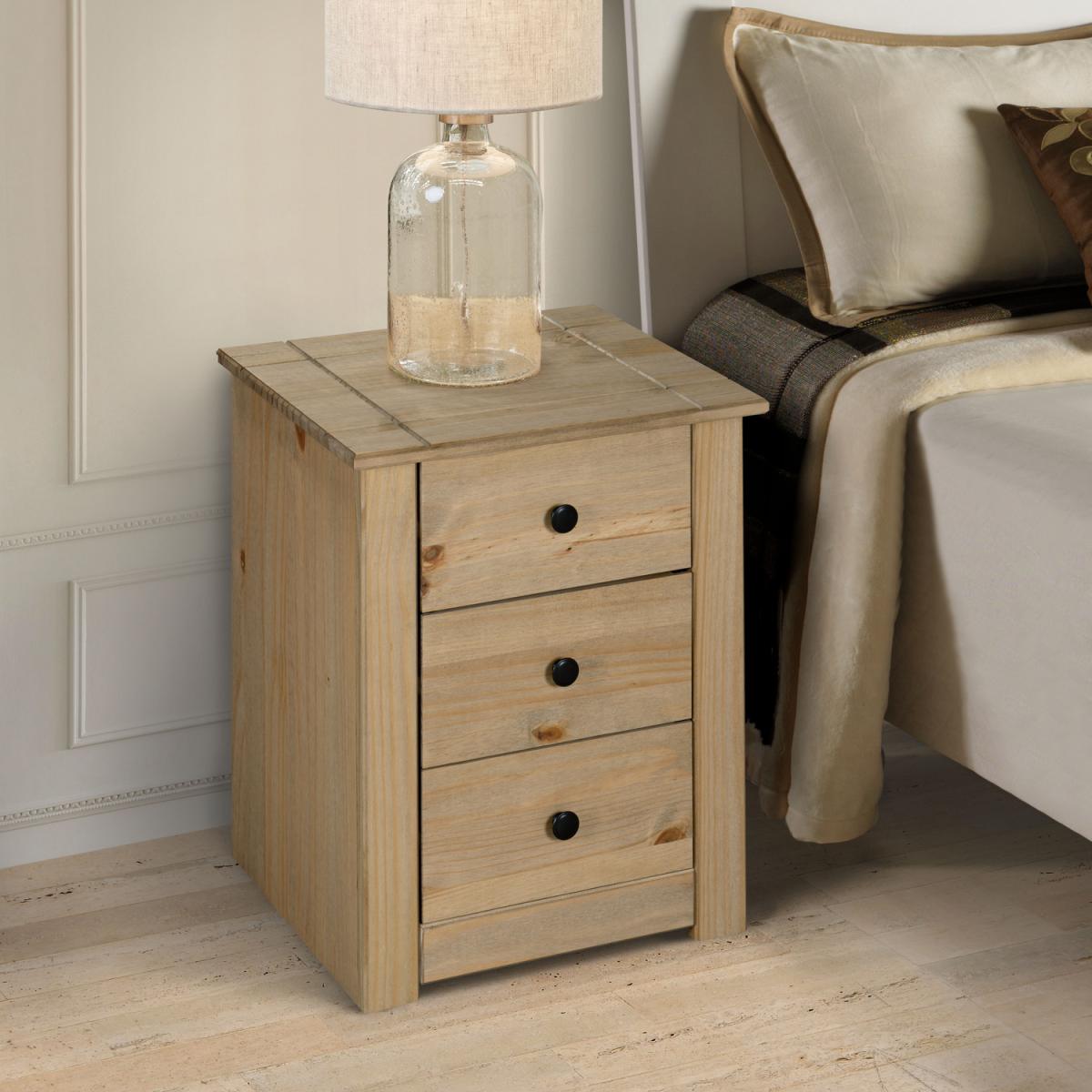 The Panama 3 Drawer Bedside Table has a rustic design that adds a touch of rustic charm to your bedroom decor. This bedside cabinet features three spacious drawers that provide ample storage space for books, glasses, and other bedside essentials. The bedside table has a natural pine colour making it a perfect fit for most bedroom spaces. This bedside table is perfect for anyone who wants to add a touch of rustic charm to their bedroom decor while also having practical storage for their bedside essentials.