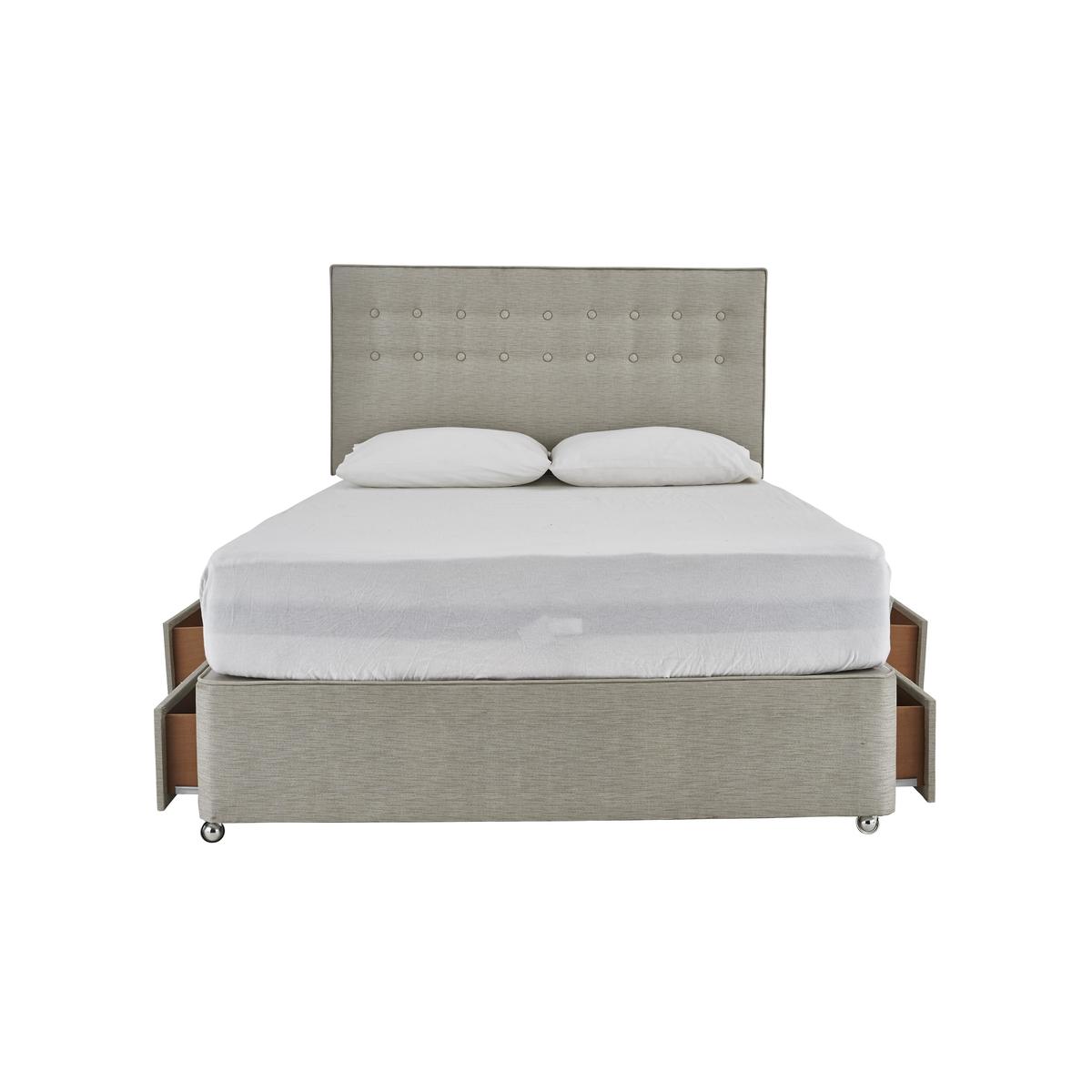 Headboard illustrated is not available online. High-quality platform top divan with great storage. Wide choice of drawer arrangements. Simple, contemporary design. Luxuriously upholstered in a stylish, modern fabric. Headboard is optional extra. Fits a standard size mattress. Mattress available separately. Product images are representative. Find out more.