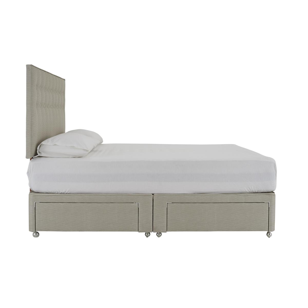 Headboard illustrated is not available online. High-quality platform top divan with great storage. Wide choice of drawer arrangements. Simple, contemporary design. Luxuriously upholstered in a stylish, modern fabric. Headboard is optional extra. Fits a standard size mattress. Mattress available separately. Product images are representative. Find out more.