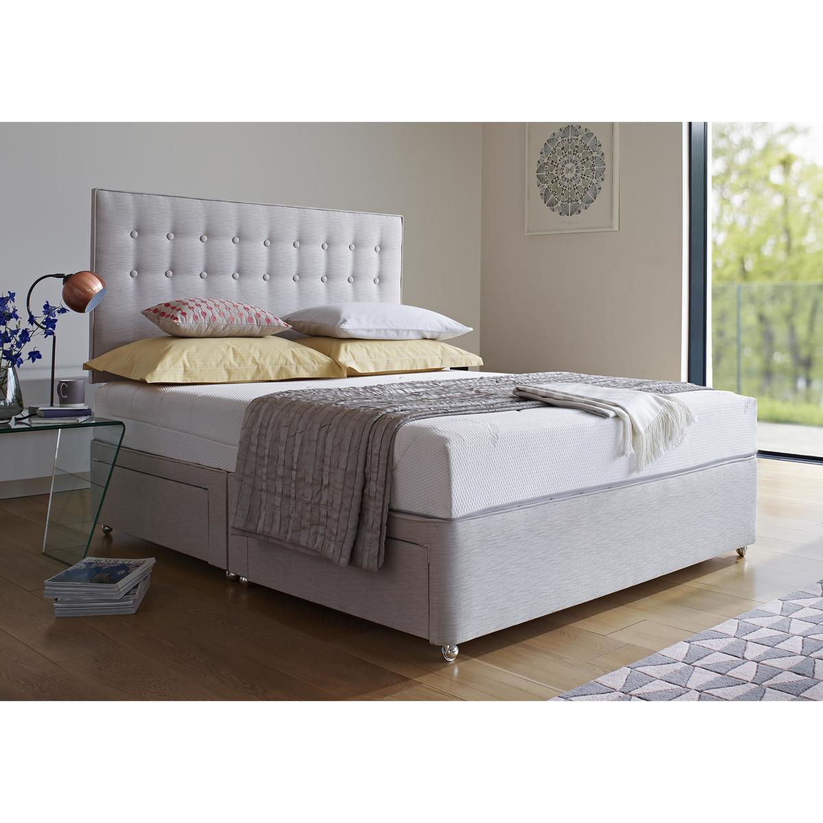 Headboard illustrated is not available online. High-quality platform top divan with great storage. Wide choice of drawer arrangements. Simple, contemporary design. Luxuriously upholstered in a stylish, modern fabric. Headboard is optional extra. Fits a standard size mattress. Mattress available separately. Product images are representative. Find out more.