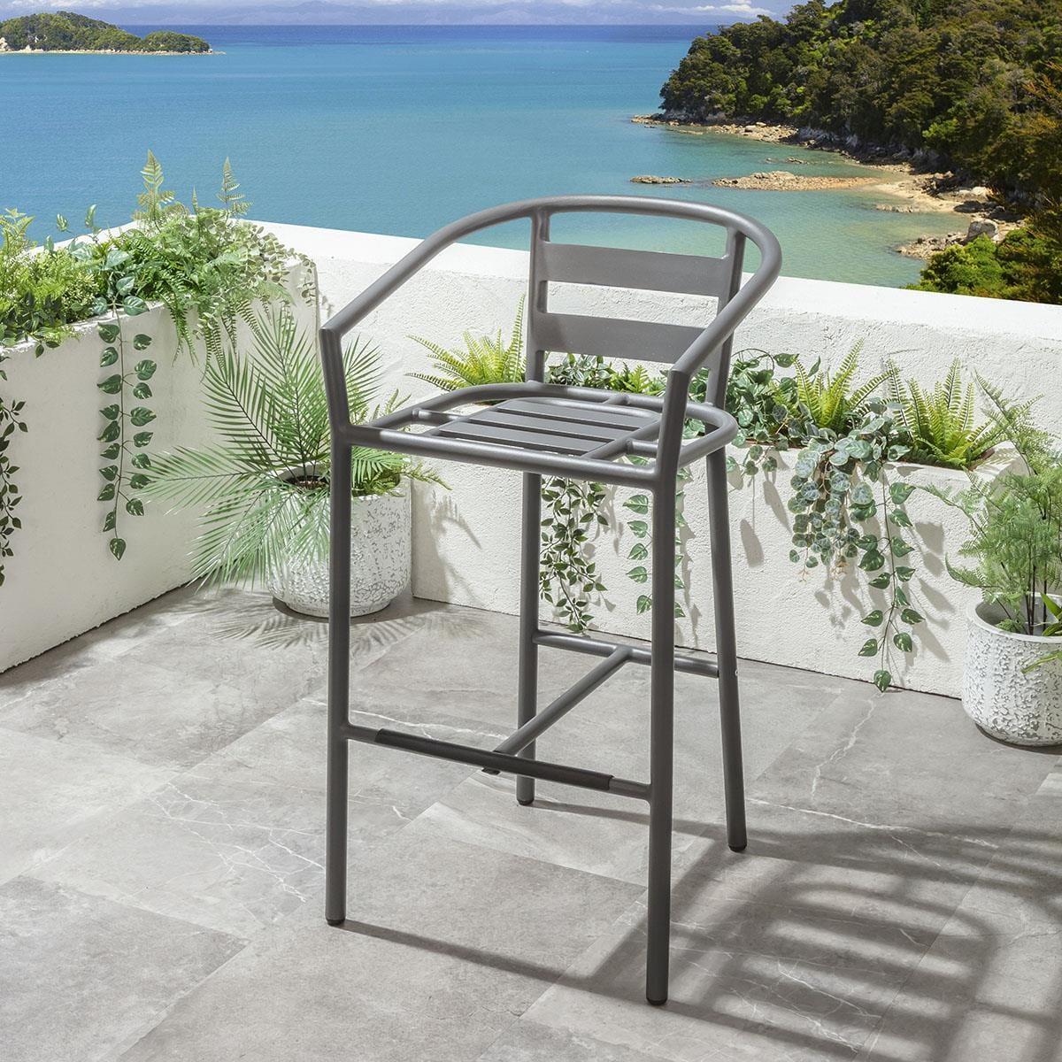 Perfect for those who want high-quality, comfy garden bar stools that can be used right after any rain. Our Mia outdoor bar chairs in grey boast a minimalist design - crafted with an aluminum frame. These garden stools are not only stylish but also completely weatherproof and durable, with removable cushions. Crafted with a complete aluminum frame, the Mia outdoor bar stools are weatherproof and super durable, combining style with functionality. The aluminum construction ensures that they can be left uncovered year-round, standing up to the elements without compromising aesthetics. The sleek design adds a touch of sophistication to any outdoor dining table setting. Sink into luxury with the premium seat cushions that accompany these garden bar stools. Featuring a thick foam base pad and soft back cushion, upholstered in durable smoke grey fabric, the comfort they provide is unmatched. The best part? The cushions are removable, allowing for convenient storage when not in use. Innovatively designed for British weather, our Mia garden bar chairs are not only stylish and comfortable but also practical. The stackable frames make storage a breeze, while the weatherproof construction guarantees longevity. W56cm D54cm H116cm Seat Height 81cm Single Bar Stool