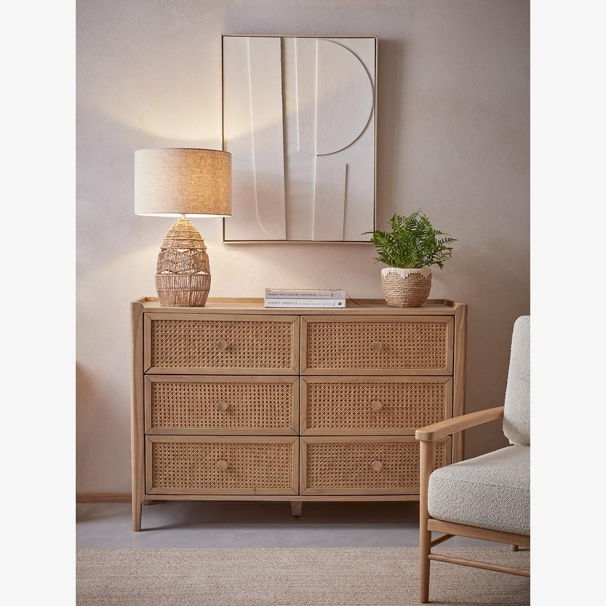 I’m a big fan of this Mia chest for its mix of rattan panels and clean lines - it brings texture without overwhelming a room. The light oak frame works brilliantly in Scandi, coastal or relaxed boho schemes, pairing easily with soft neutrals or muted greens. For styling, keep the top minimal: a woven‐base lamp, a small stack of books and a plant look fresh without clutter. Inside the drawers, use fabric organisers or small boxes to keep things tidy - it’s ideal for storing linens, paperwork or off-season clothing.