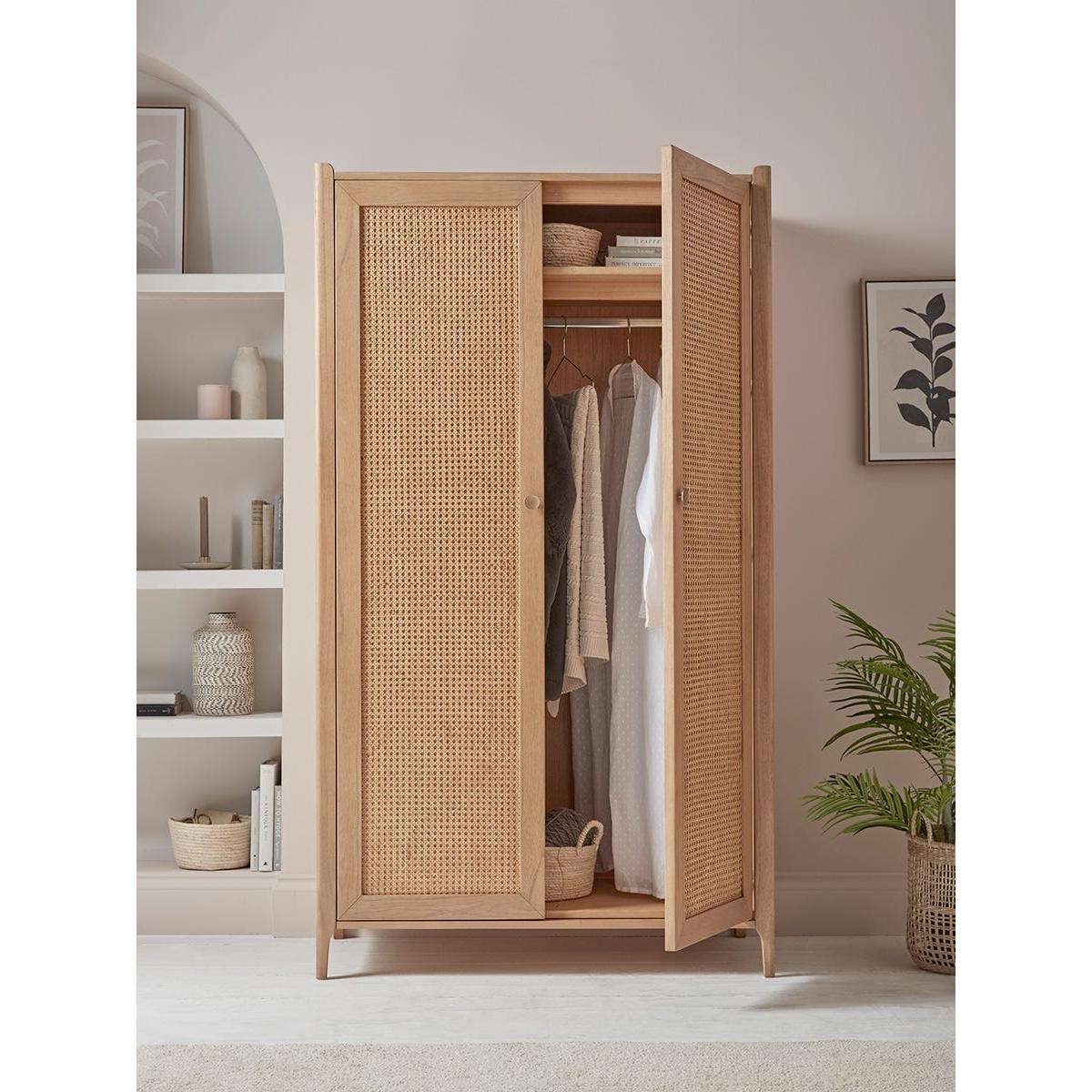 I really like this wardrobe for its minimalist, Scandinavian-inspired look, which works beautifully in modern interiors with light wood tones or neutral palettes. Its fuss-free design with cane panels adds subtle texture, making it a versatile piece that complements both contemporary and boho styles. Practical tips include pairing it with open shelving or decorative baskets for organisation, while keeping colour schemes light and airy will enhance its natural finish. It’s ideal for bedrooms that need a stylish yet functional storage solution, and the cane detail also helps it feel less bulky, making it a great choice for smaller spaces.