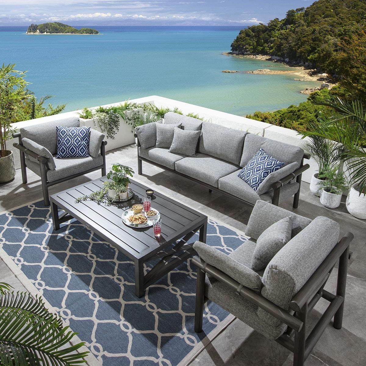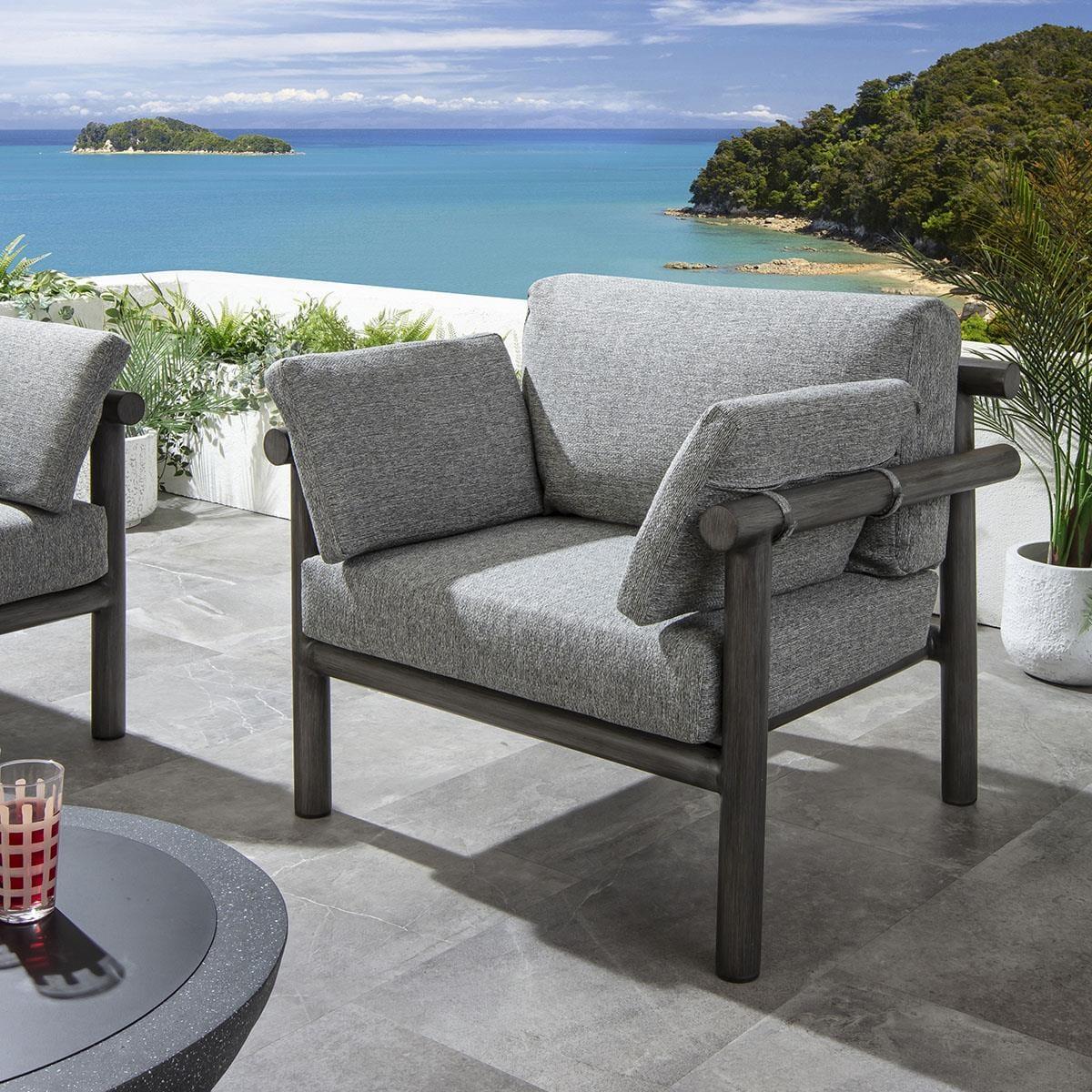 The Mia log style garden armchair, a blend of luxury and durability. Crafted with a full aluminium frame designed to resemble rustic log furniture, this garden armchair features a smoked grey wood effect finish for an elegant touch. Complete with cushions upholstered in premium woven outdoor fabric in grey. The smoked grey wood effect finish of our Mia garden armchair's frame brings a touch of sleek natural elegance to any outdoor setting. With hand finished wood grain effect paint, this wood effect garden armchair exudes the charm of rustic log furniture, elevating your outdoor decor to new heights of sophistication. Crafted from full aluminum, our garden armchair's frame is not only durable and sturdy but also weather-proof, ensuring long-lasting outdoor use without compromising on style. Its solid construction requires no assembly, making it the ideal choice for hassle-free outdoor relaxation. Sink into ultimate comfort with our garden armchair's seat, back, and arm cushions, all crafted from luxury high-density foam and upholstered in premium woven outdoor fabric in grey. Plus, with included covers, maintenance is a breeze. For optimal longevity, we recommend storing cushions when not in use, ensuring your outdoor oasis remains inviting season after season. W90cm D85cm H76cm Aluminium frame - no assembly required Weather cover included
