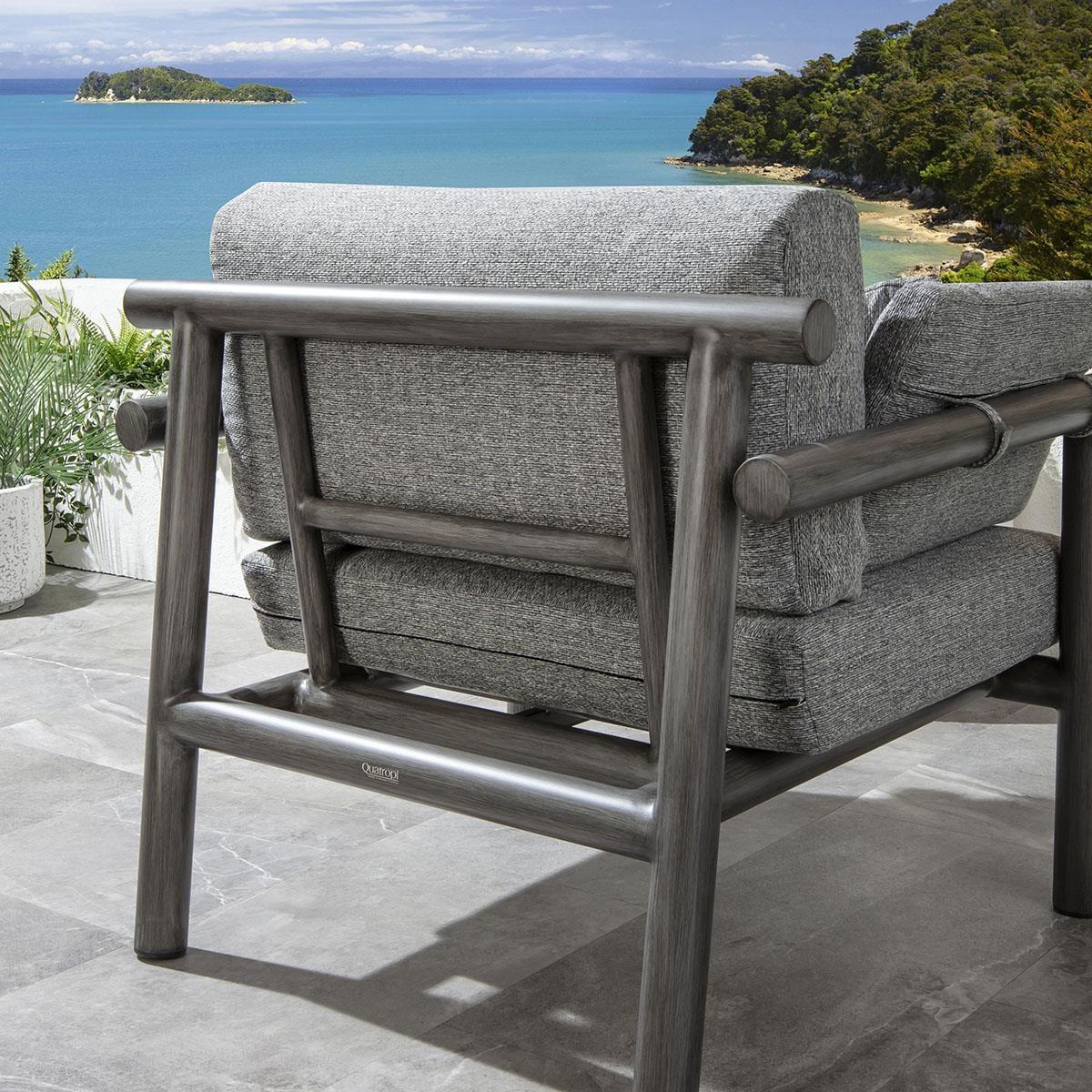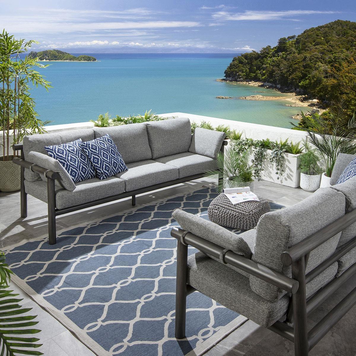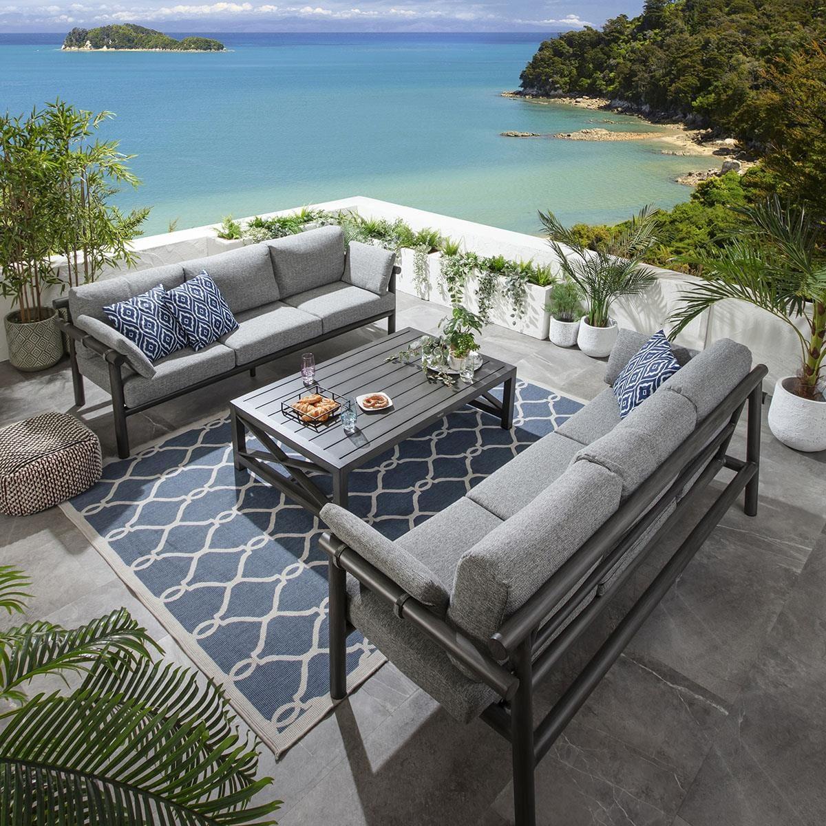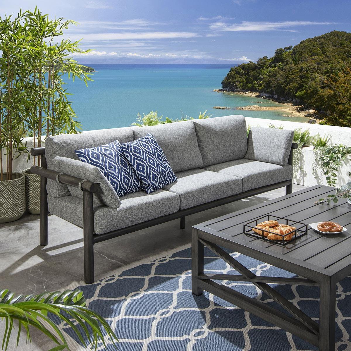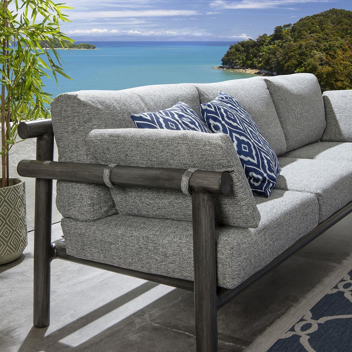 The Mia log style garden sofa, perfect for rustic outdoor spaces. This 220cm outdoor sofa boasts a solid aluminium frame designed to resemble rustic log furniture, finished with a smoked grey wood effect. Crafted for comfort, it includes high density foam cushions upholstered in premium woven outdoor fabric in grey. The Mia aluminium outdoor sofa features a stunning smoke grey wood effect finish on its aluminium frame, creating the look of rustic log furniture. The natural-looking grains add warmth and charm to your outdoor oasis, making it the perfect addition to any garden or patio. Crafted from full aluminium, our garden sofa is not only durable but also weatherproof, ensuring it stands the test of time in any outdoor environment. The solid frame requires no assembly and is designed to provide stability and support, making it the best outdoor sofa choice for your luxury garden furniture collection. Relax in style with our outdoor sofa, complete with cushions and covers for added comfort and protection. The sofa includes seat, back and arm cushions, crafted from luxury high density foam for ultimate relaxation. We recommend storing the cushions when not in use to prolong their lifespan and keep them looking their best. W220cm D85cm H76cm Aluminium frame - no assembly required Weather cover included